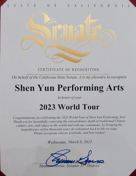 加州州參議員香農﹒格羅夫(Shannon Grove)是加州州參議員,2019年至2021年期間,還擔任加州參議院的少數派領袖。她在褒獎中說:「我代表加州州參議院,非常榮幸地表彰神韻藝術團舉行2023年世界巡迴演出!」