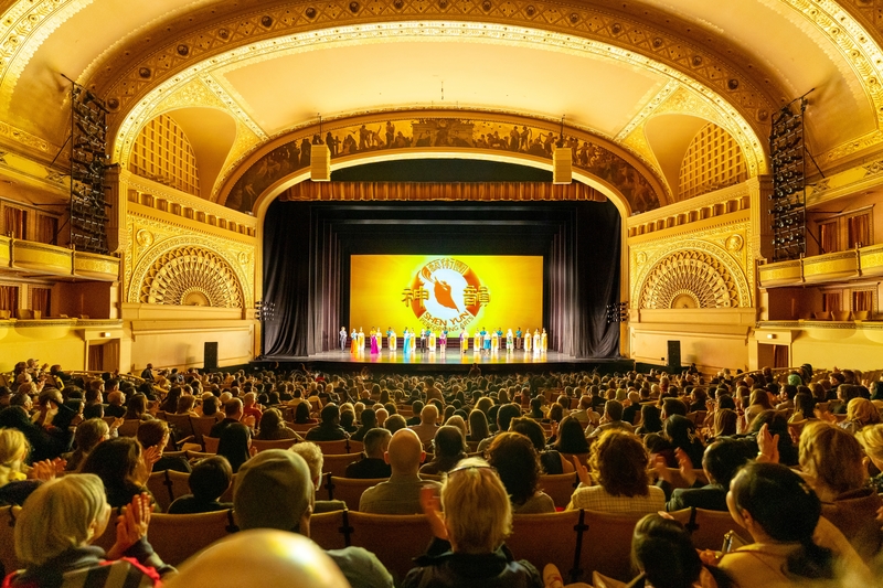 ![]() 圖5:二零二三年四月九日,神韻北美藝術團在美國芝加哥禮堂劇院(Auditorium Theatre)上演的本年度最後一場演出圓滿落幕。圖為演員謝幕照。(大紀元) |