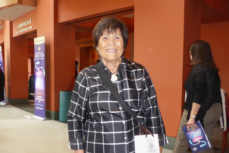 李美玲來自中國安徽省,早年來美國留學,後成為工程師,現已退休。她讚歎演出的方方面面,「我覺得跳舞的技術、歌唱,還有節目主持人都很好。(背景天幕)好像真的人飛起來一樣,很真實。」