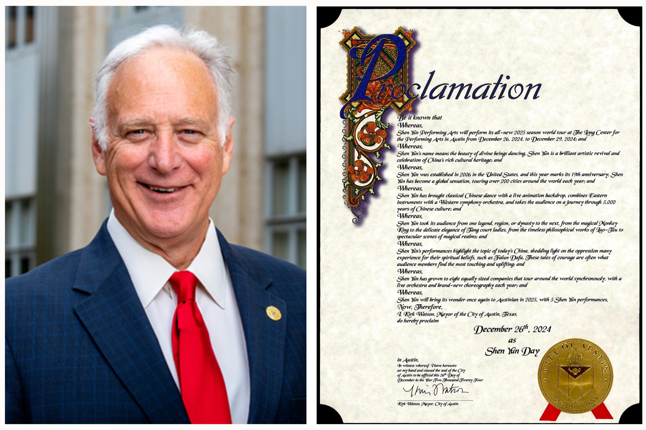 神韻開啟二零二五演季之際,美國德州奧斯汀市長柯克・沃森(Kirk Watson)發來褒獎信,盛讚「神韻是對中國深厚文化遺產的一場輝煌藝術復興與慶典」,並宣布「二零二四年十二月二十六日為神韻日(Shen Yun Day)」。