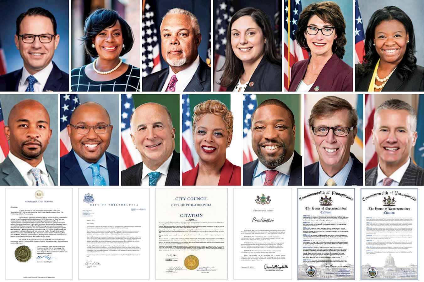 神韻重返費城前夕,賓州州長夏皮羅(Josh Shapiro)、費城市長帕克(Cherelle L. Parker)、賓州州參議員威廉姆斯(Anthony H. Williams)和卡佩萊蒂(Amanda M. Cappelletti);賓州州眾議員艾薩克森(MaryLouise Isaacson)、瑞吉娜﹒楊(Regina G. Young)、尼爾森(Napoleon J. Nelson)和斯科特(Greg Scott);特拉華州州眾議員拉蒙(Michael J. Ramone) 和耶裏克(Lyndon D. Yearick),以及費城市議會,紛紛給神韻主辦方──大費城法輪大法學會發來賀信和對神韻藝術團的褒獎狀,感謝神韻藝術團與大費城地區及全球觀眾分享幾近失落的中國五千年文化,稱神韻「用希望為我們的城市注滿活力」,並預祝神韻演出成功。
