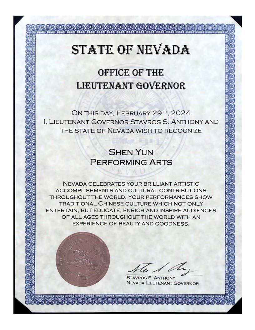安東尼並特意帶褒獎到劇院,表彰神韻藝術團卓越的藝術成就與在全球做出的文化貢獻。他說:「我知道神韻每年都來,但這是千載難逢的體驗,你需要來見識這絕無僅有的體驗。我想感謝所有藝術家們到拉斯韋加斯市與我們分享神韻。」