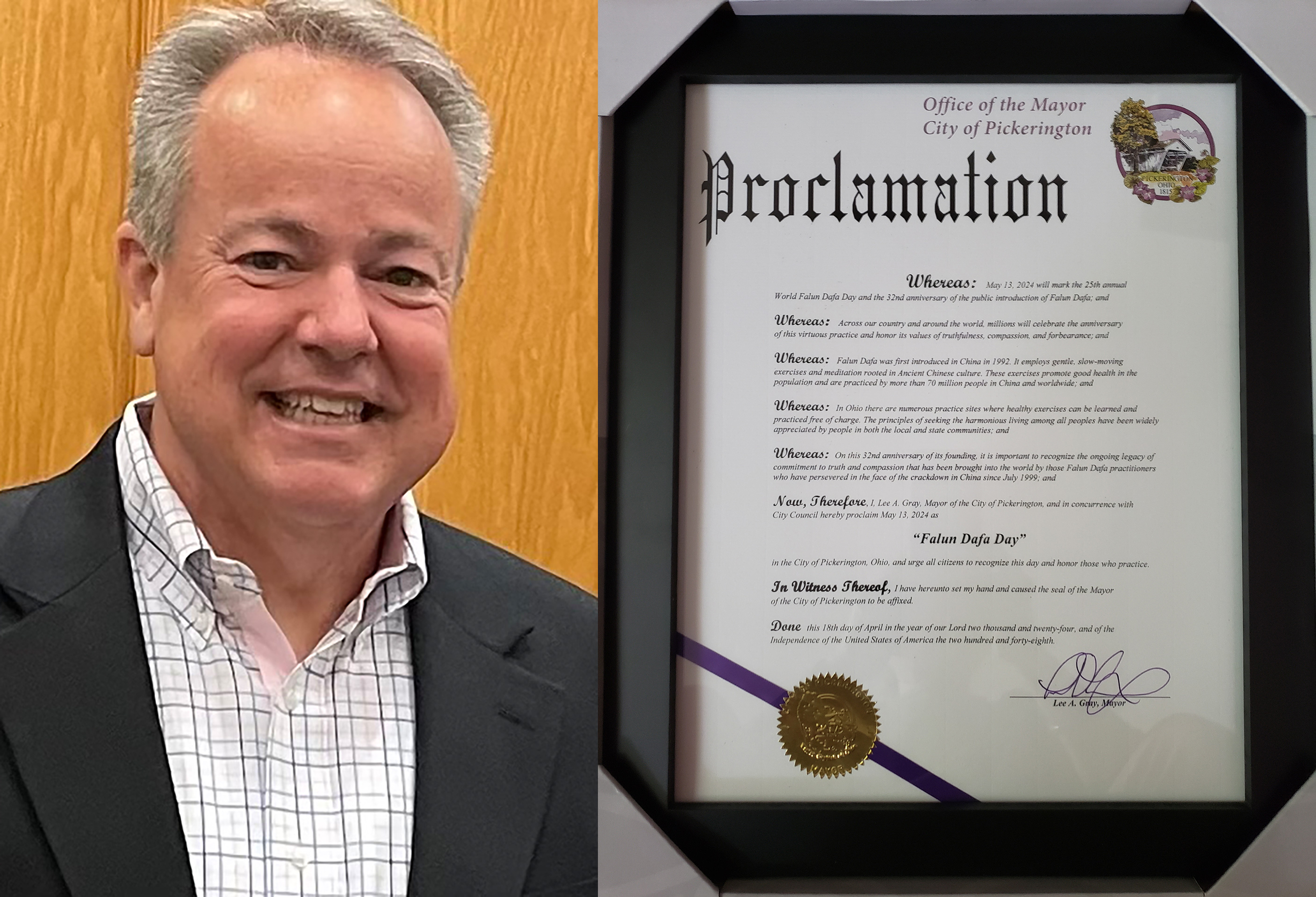 現在,因此,我,李,A,格雷,皮克林頓市市長,在此宣布二零二四年五月十三日為皮克林頓市的「法輪大法日」。敦促所有公民認識到這一天並尊重那些實踐的人。