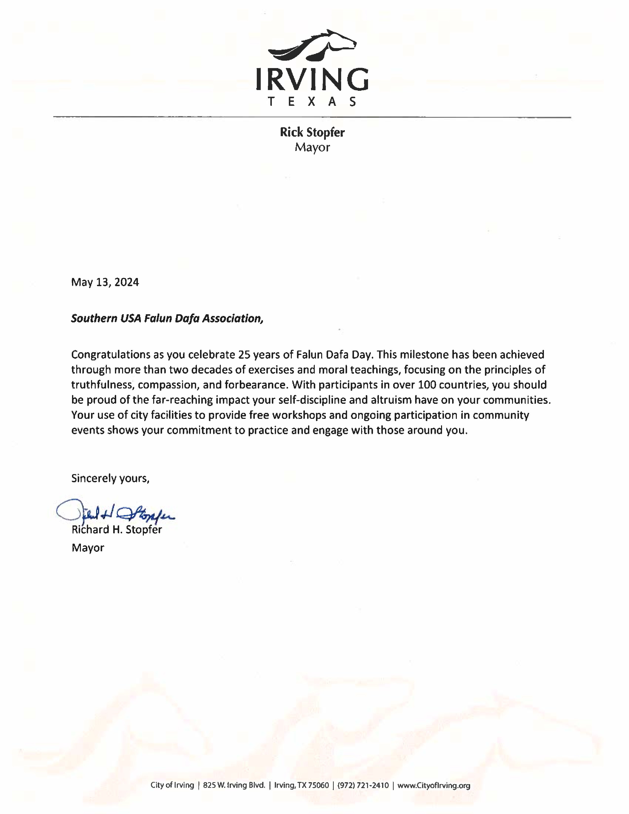 美國德州歐文市(City of Ivring)市長理查德﹒斯托弗(Richard Stopfer)的來函說:「祝賀你們慶祝第二十五屆法輪大法日!這個里程碑是通過二十多年的注重按照真、善、忍的原則的修煉和道德提升而取得的。你們的修煉遍及世界上一百多個國家,你們應該為自己的理念和為他的精神而對社區產生的深遠影響感到自豪。你們通過使用市政府的設施為(居民)提供免費教功班持續參與社區活動,這些展示了你們致力於對社區做出的貢獻。」