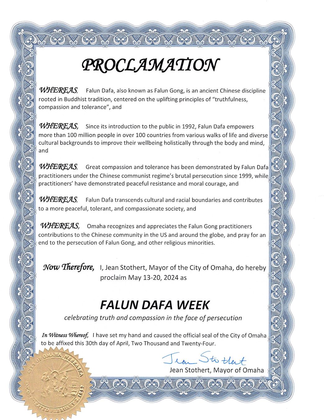 因此, 我珍﹒斯托瑟特,奧馬哈市市長,特此宣布,二零二四年五月十三日至二十日為「法輪大法週」,面對迫害仍然慶祝真誠和善良。