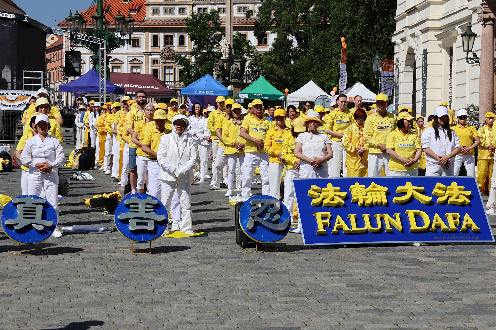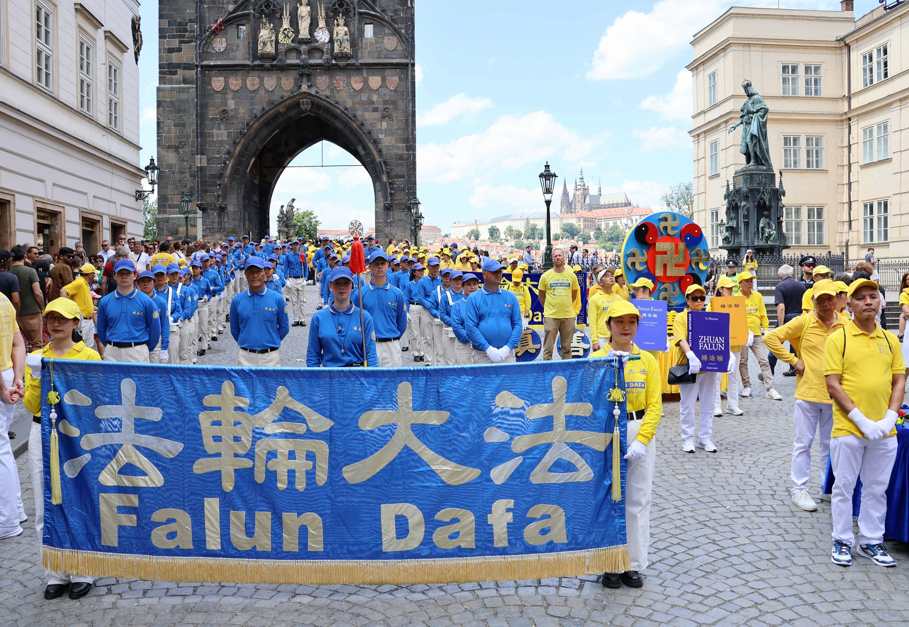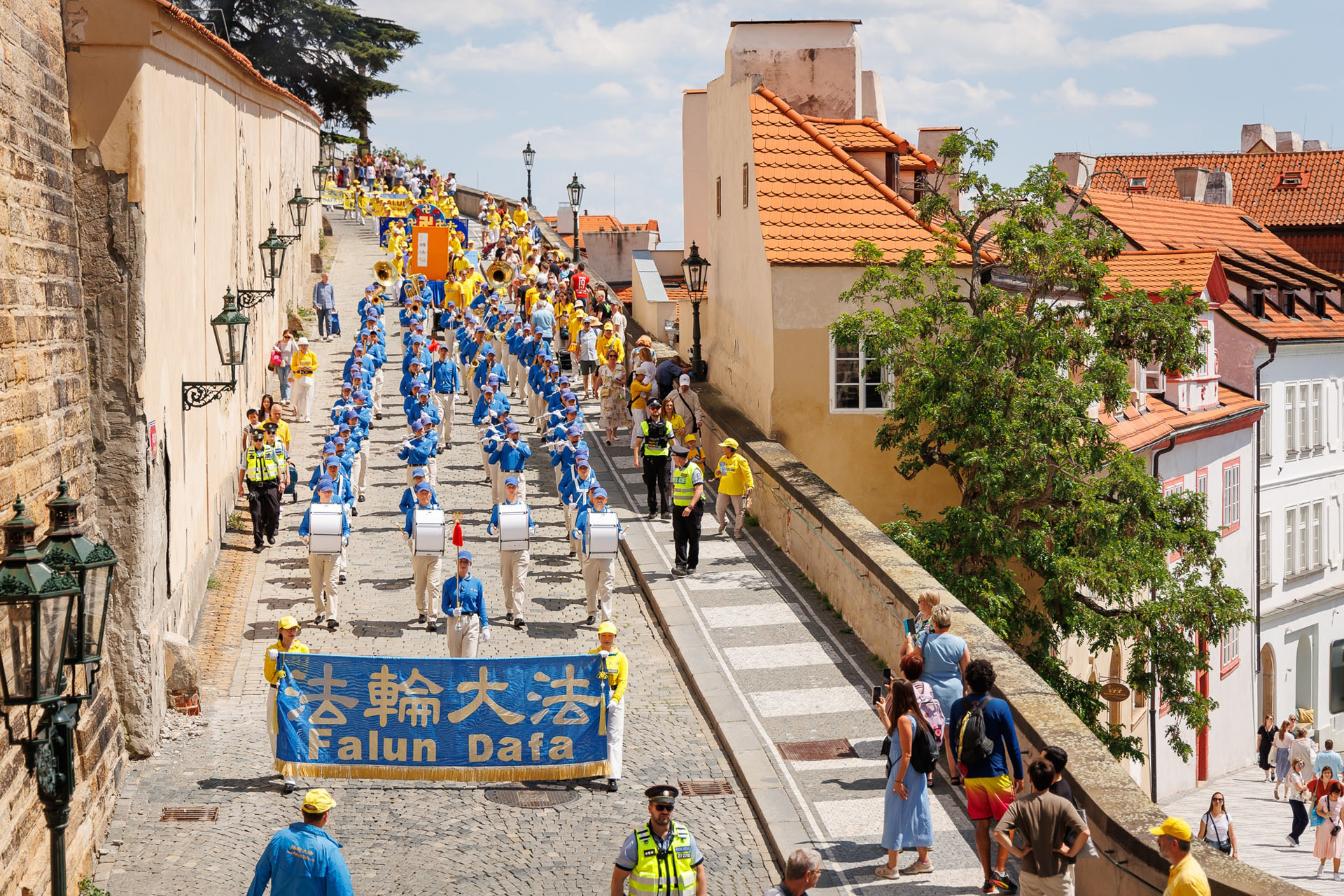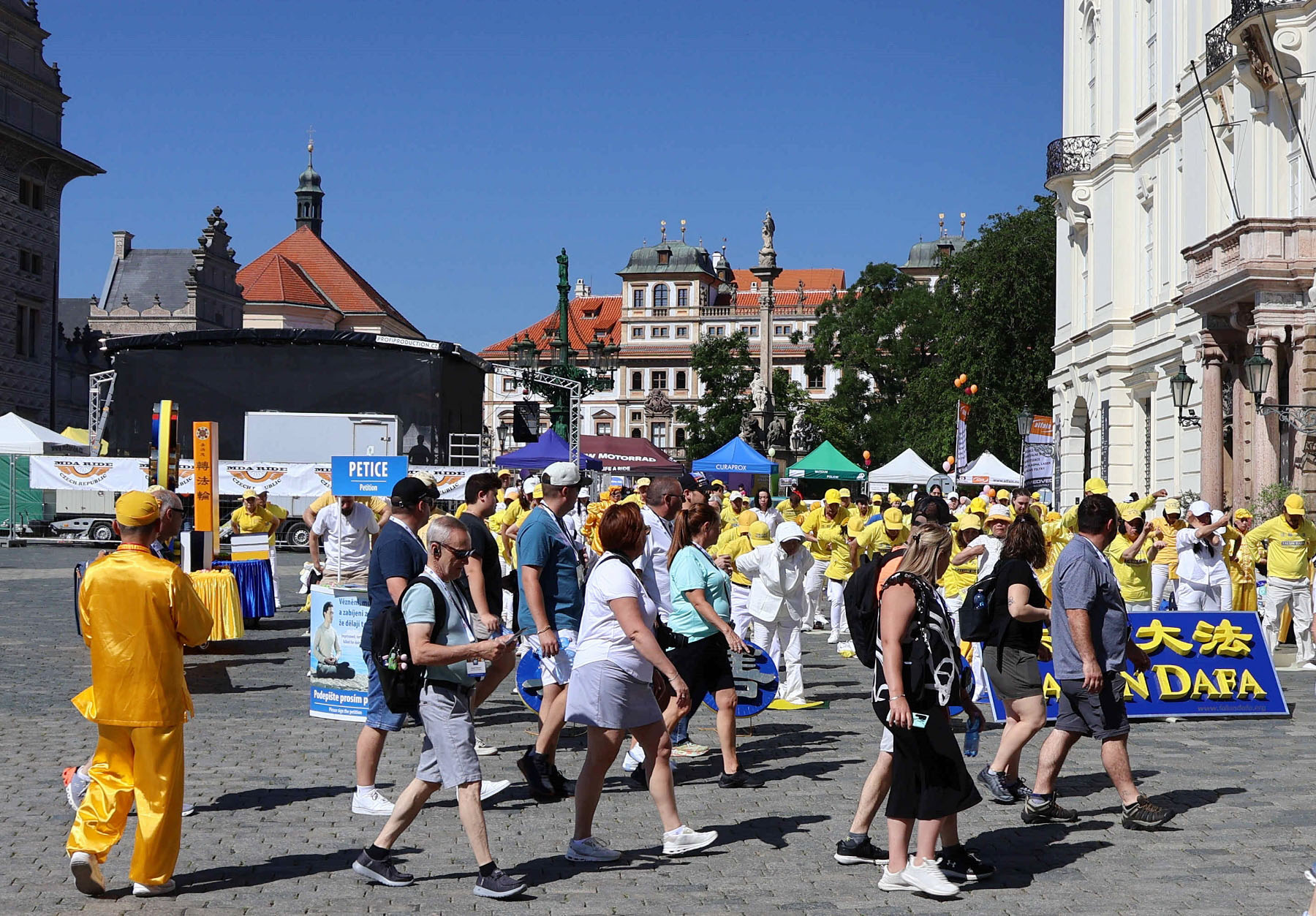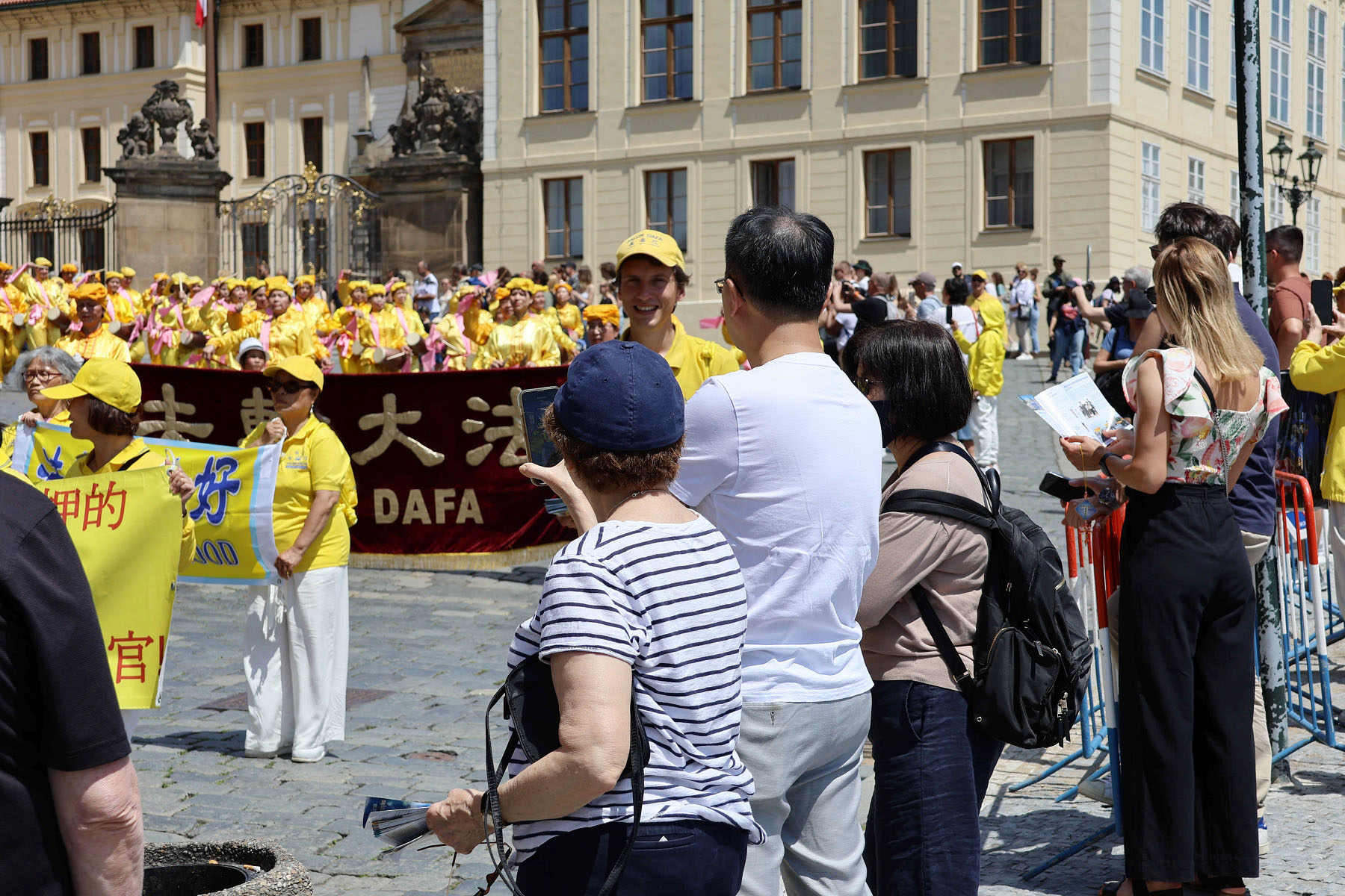 六月八日,適逢陽光燦爛的週六,布拉格城堡廣場(Hradcany Square)再度湧現熙熙攘攘的人群,或參觀城堡,或觀看換崗,或參加當日的集會。在嘈雜中,一群身著黃衣的法輪大法修煉者微閉雙目,隨著悠揚的音樂聲做著緩慢柔和的動作,與周圍的喧鬧形成對比。