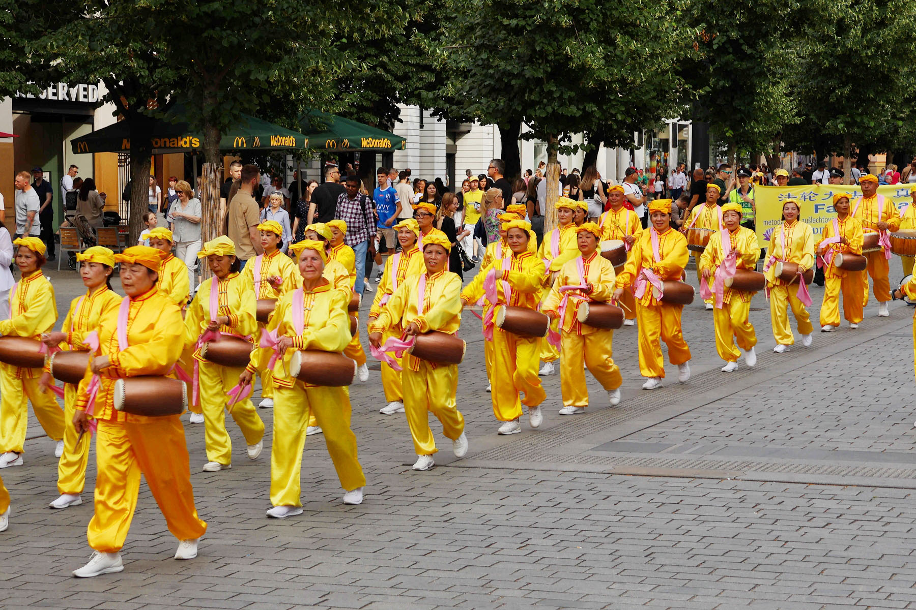 隨後展現的是《轉法輪》一書的模型。修煉法輪功的學員都會閱讀此書,從中領悟如何在日常生活中按照真、善、忍準則為人處世,如何成為一個先他後我的人,這本書已經被翻譯成四十多種文字版本,並可在法輪大法網站(falundafa.org)免費下載。緊跟其後的是展示功法的方陣及傳遞「法輪大法好」訊息的多條橫幅。在引人注目的金龍後面是舞獅隊。中間也有揭露中共迫害罪刑的方陣,最後壓陣的是活潑親切的腰鼓隊。