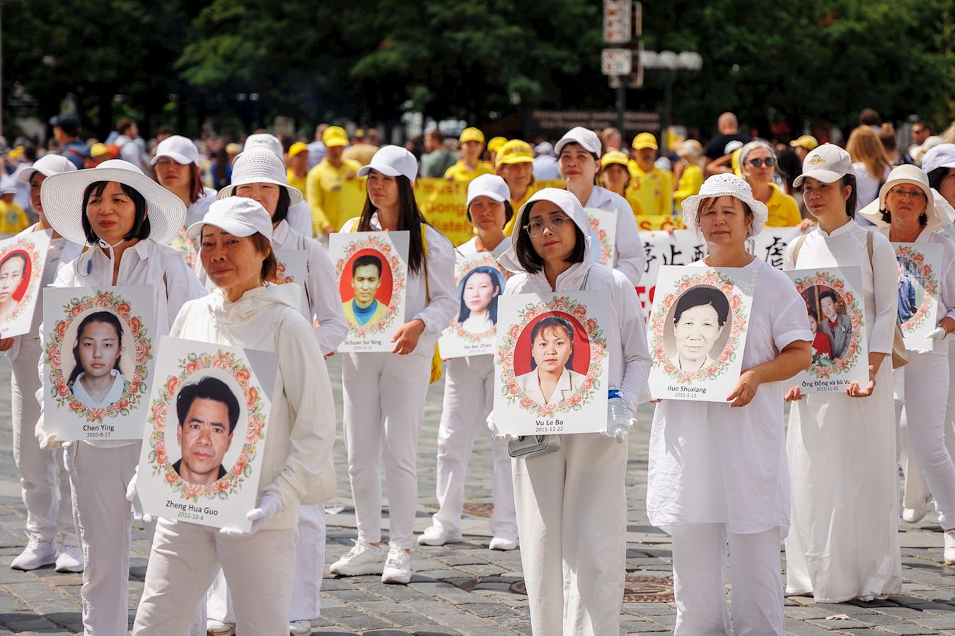 ![]() 圖1:遊行隊伍中,法輪功學員捧著被迫害致死同修的遺照。因中共信息封鎖,無法獲悉在過去的二十五年裏確切有多少位法輪功學員被迫害致死。 |