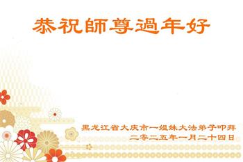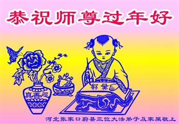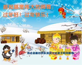 尊敬的師父您好!我是大法弟子的家屬,很相信法輪大法好!真善忍好!過年了,我讓姥姥幫我給師父發個賀卡。祝願師父年年好!天天快樂!