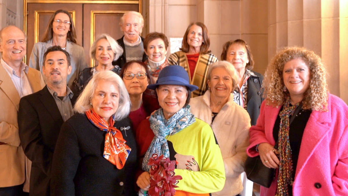 ![]() 圖8:二零二五年一月四日下午,美國加州諾瓦托(Novato)共和黨婦女聯合會會長方麗玲(前排左二),帶領會員一共十八人,觀賞了神韻北美藝術團在加州舊金山歌劇院的演出。(新唐人電視台) |