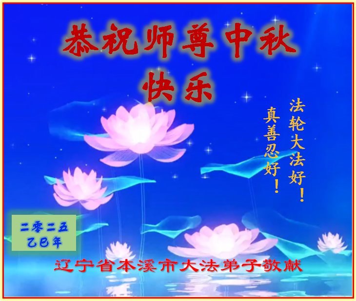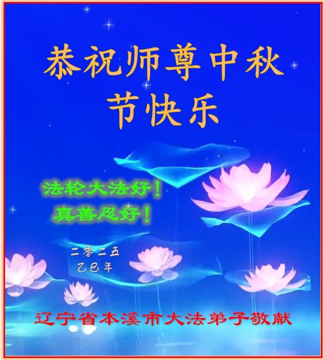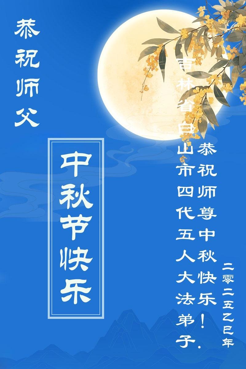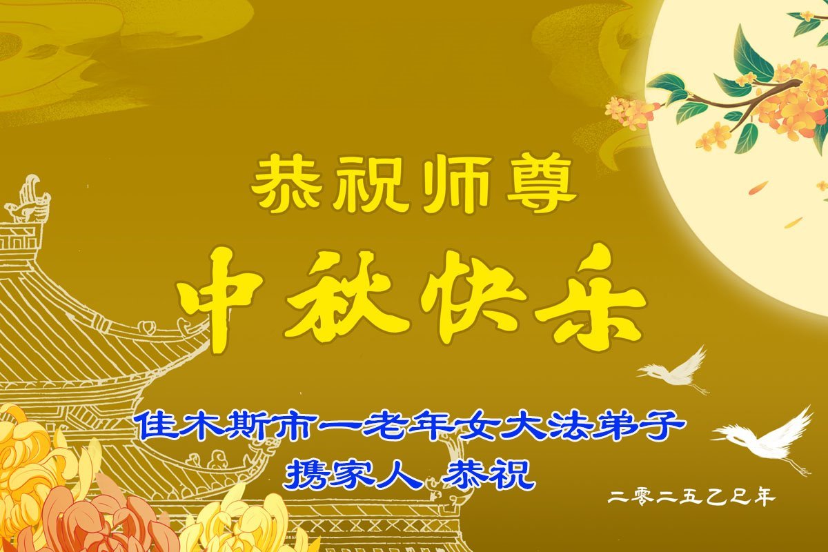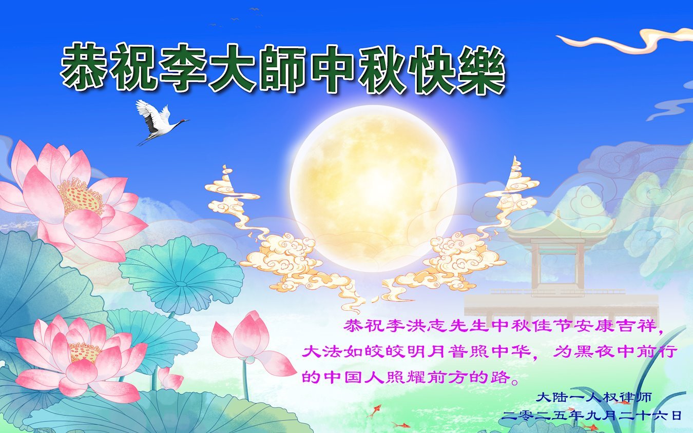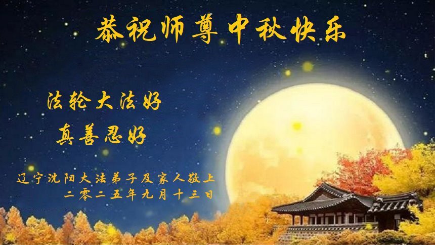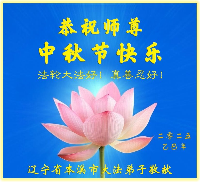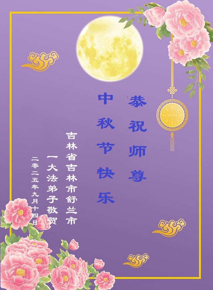 【明慧網二零二五年十月一日】(明慧網通訊員中國大陸報導)中秋佳節倍思恩,中國各省市民眾恭祝李洪志大師中秋節快樂!支持大法、得到大法佑護的中國大陸各界民眾表示:現在天災人禍,民不聊生,貪官污吏橫行霸道,老百姓都盼望中共垮台。如果人人都按真善忍做好人,社會就安定。他們在賀詞中寫道:「願中國人儘早拋棄邪黨」,「堂堂正正做一個正直的中國人」。