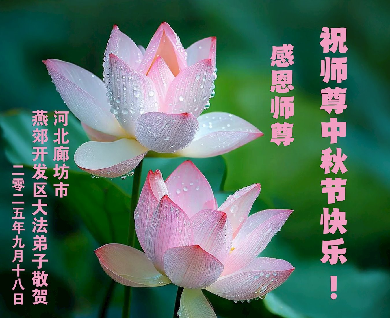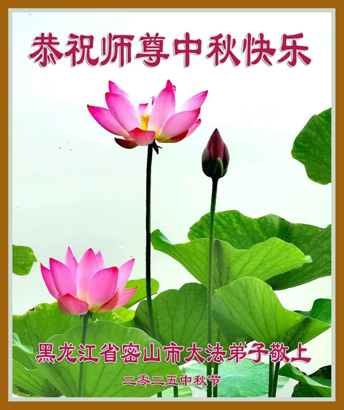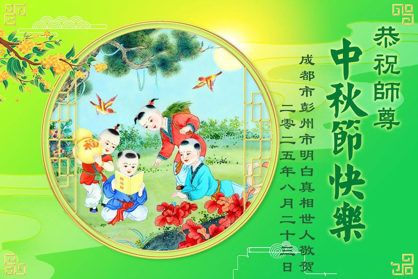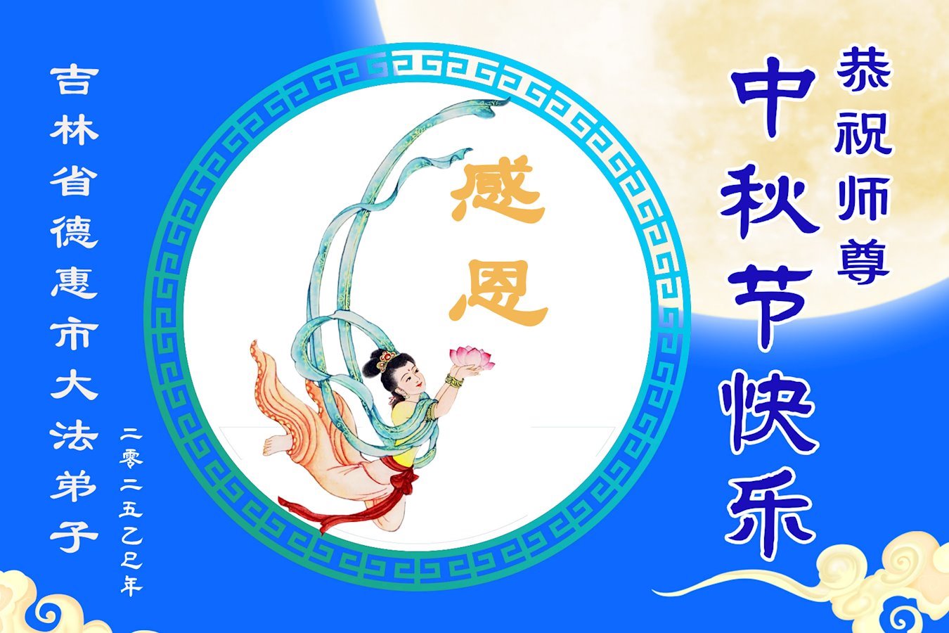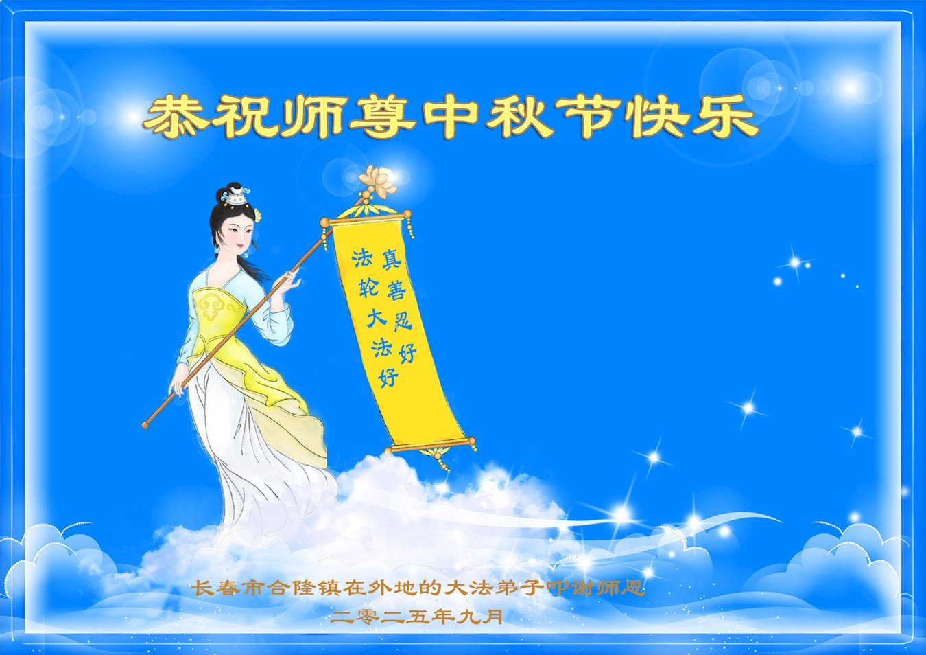 【明慧網二零二五年十月一日】(明慧網通訊員中國大陸報導)中秋佳節倍思恩,中國各省市民眾恭祝李洪志大師中秋節快樂!支持大法、得到大法佑護的中國大陸各界民眾表示:現在天災人禍,民不聊生,貪官污吏橫行霸道,老百姓都盼望中共垮台。如果人人都按真善忍做好人,社會就安定。他們在賀詞中寫道:「願中國人儘早拋棄邪黨」,「堂堂正正做一個正直的中國人」。