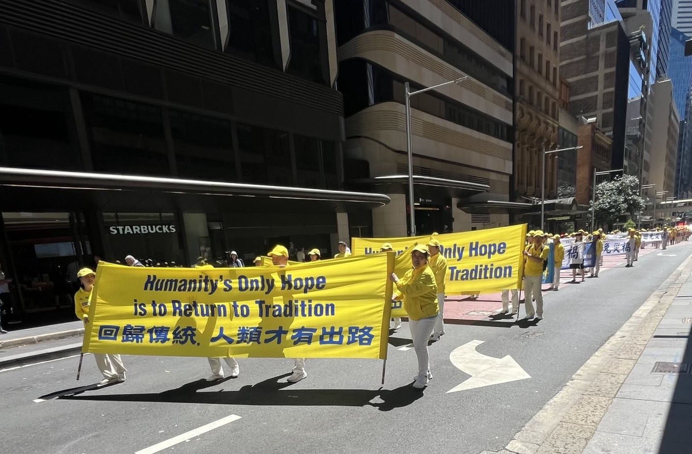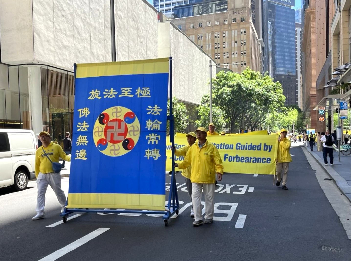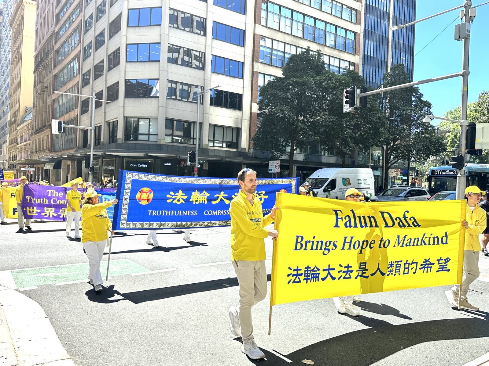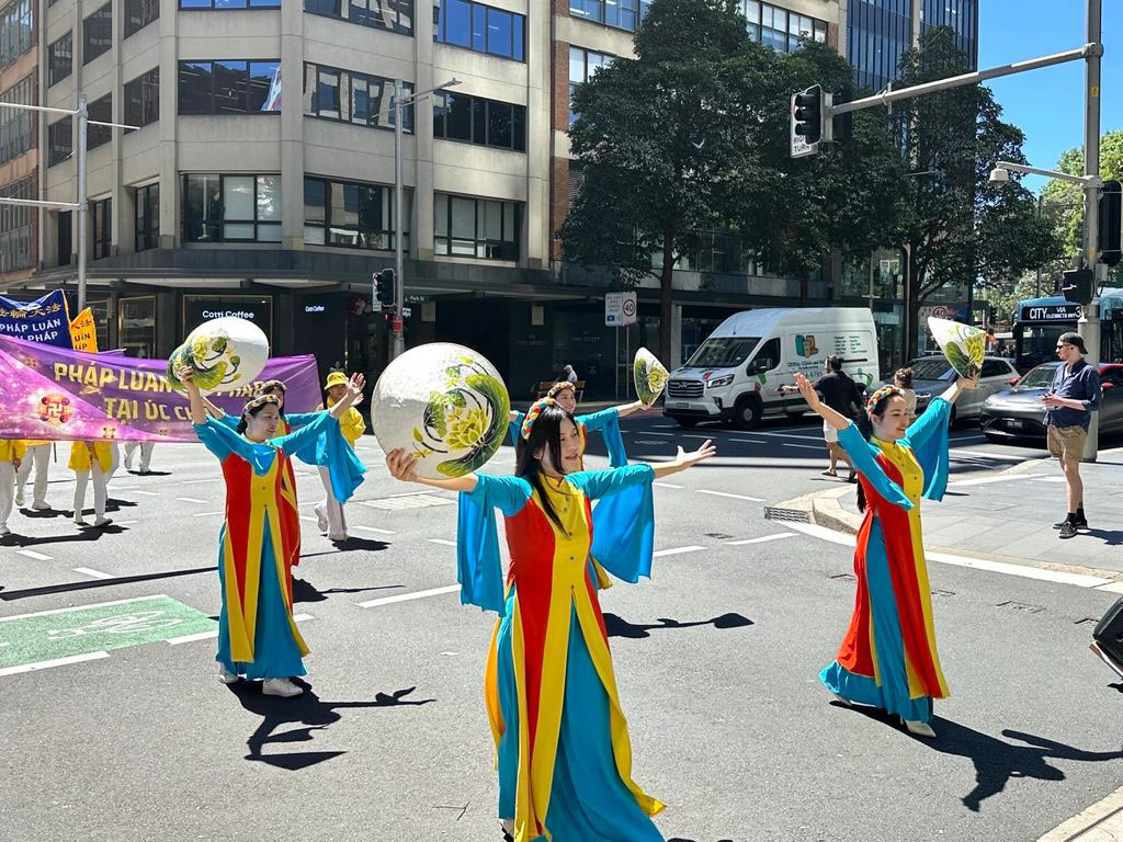 這是為期三天的二零二五年澳洲法輪大法修煉心得交流會的系列活動之一。大遊行的起點是悉尼市中心馬丁廣場(Martin Place),來自各行各業的各族裔法輪功學員通過真相橫幅和彩旗、功法展示以及色彩繽紛的表演,展現了法輪大法修煉人的善良和堅韌。