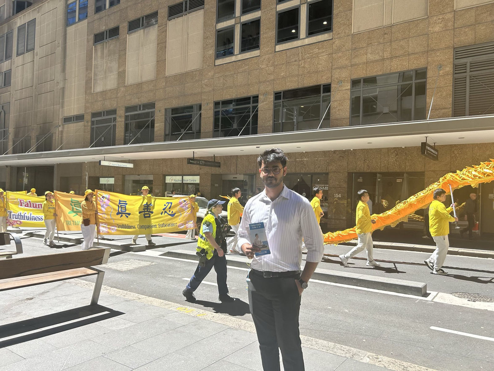 悉尼珠寶商托亞(Toya)說:「我以前看過幾次(法輪功)遊行。我認為每個人都有表達觀點的權利和言論自由。遊行隊伍非常壯觀,組織得井然有序,而且是和平的抗議。」