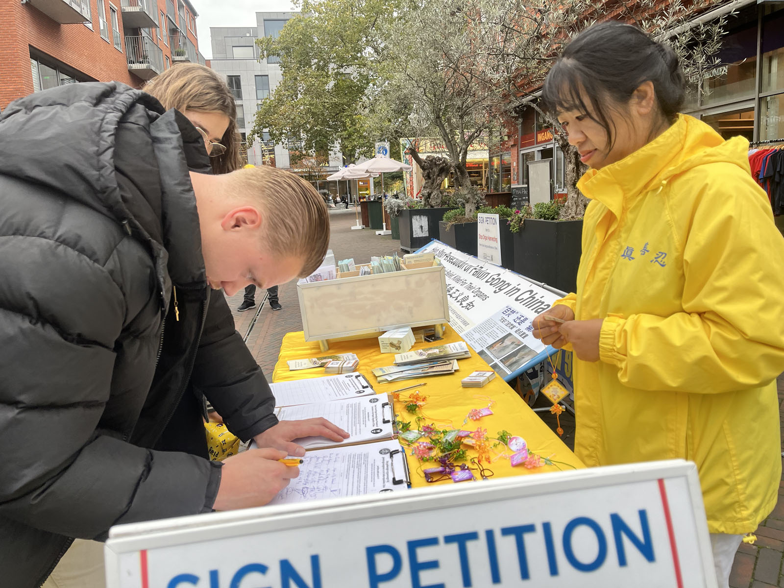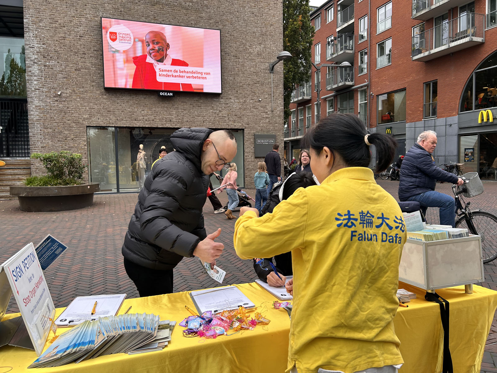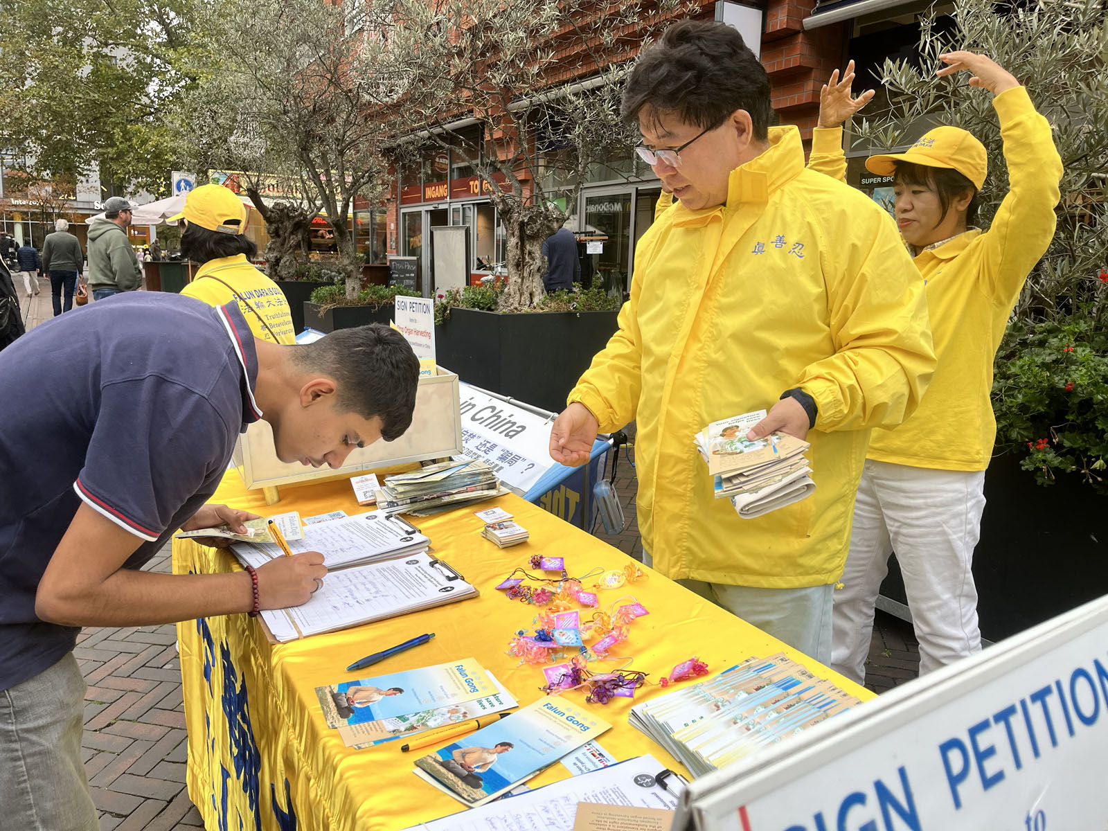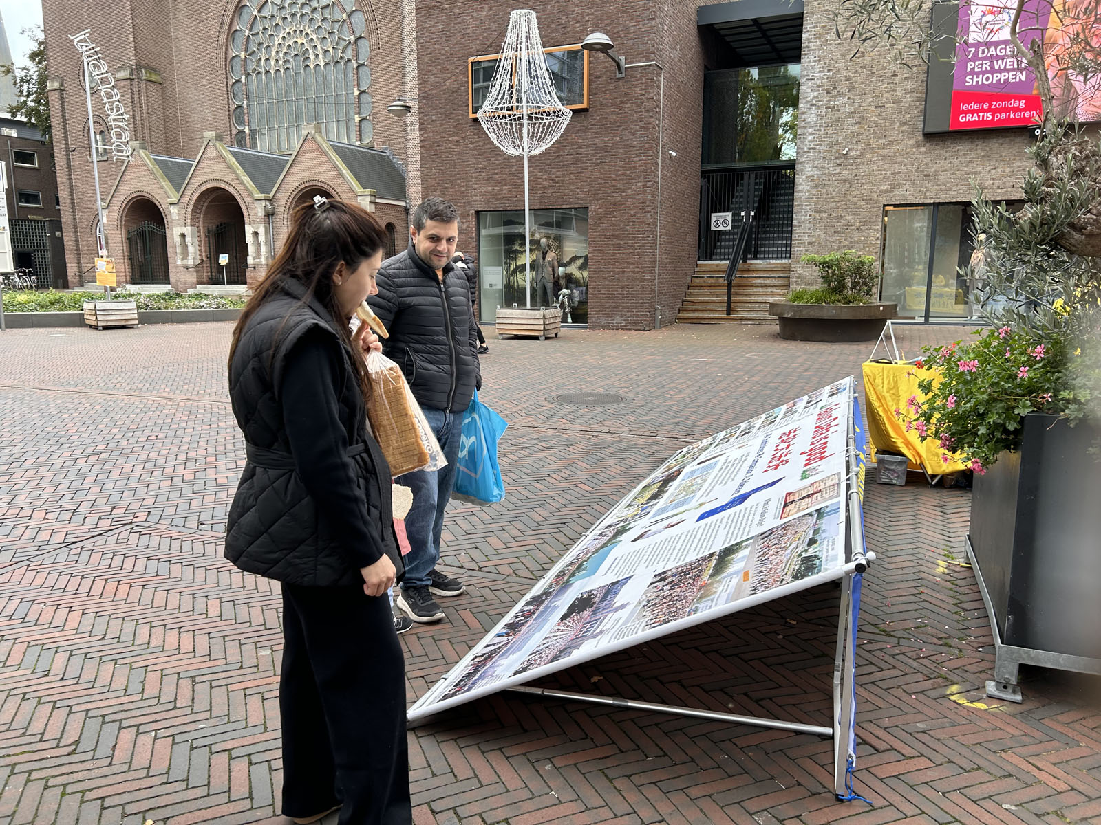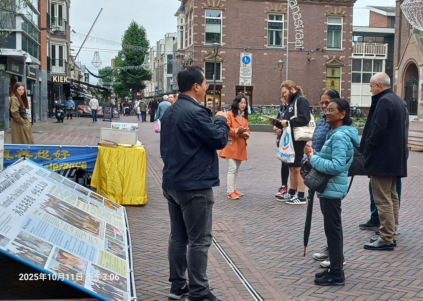 萊茵河畔阿爾芬(Alphen aan den rijn)是南荷蘭省(Zuid Holland)的一個市鎮。擁有約十二萬居民,總面積為一百三十二平方公里。中午時分,學員們在尤利婭娜街(Julianastraat)布置真相展板,展示法輪功五套功法,與民眾講述真相,向民眾徵集反對迫害的簽名。人們認真跟著學煉功動作,向學員了解大法真相。