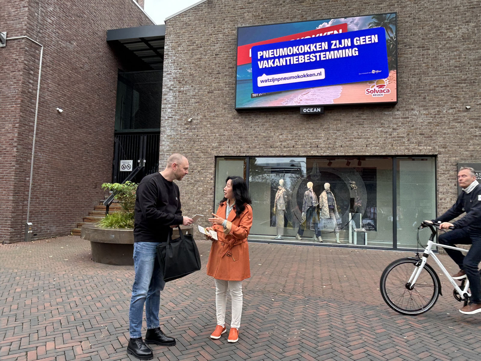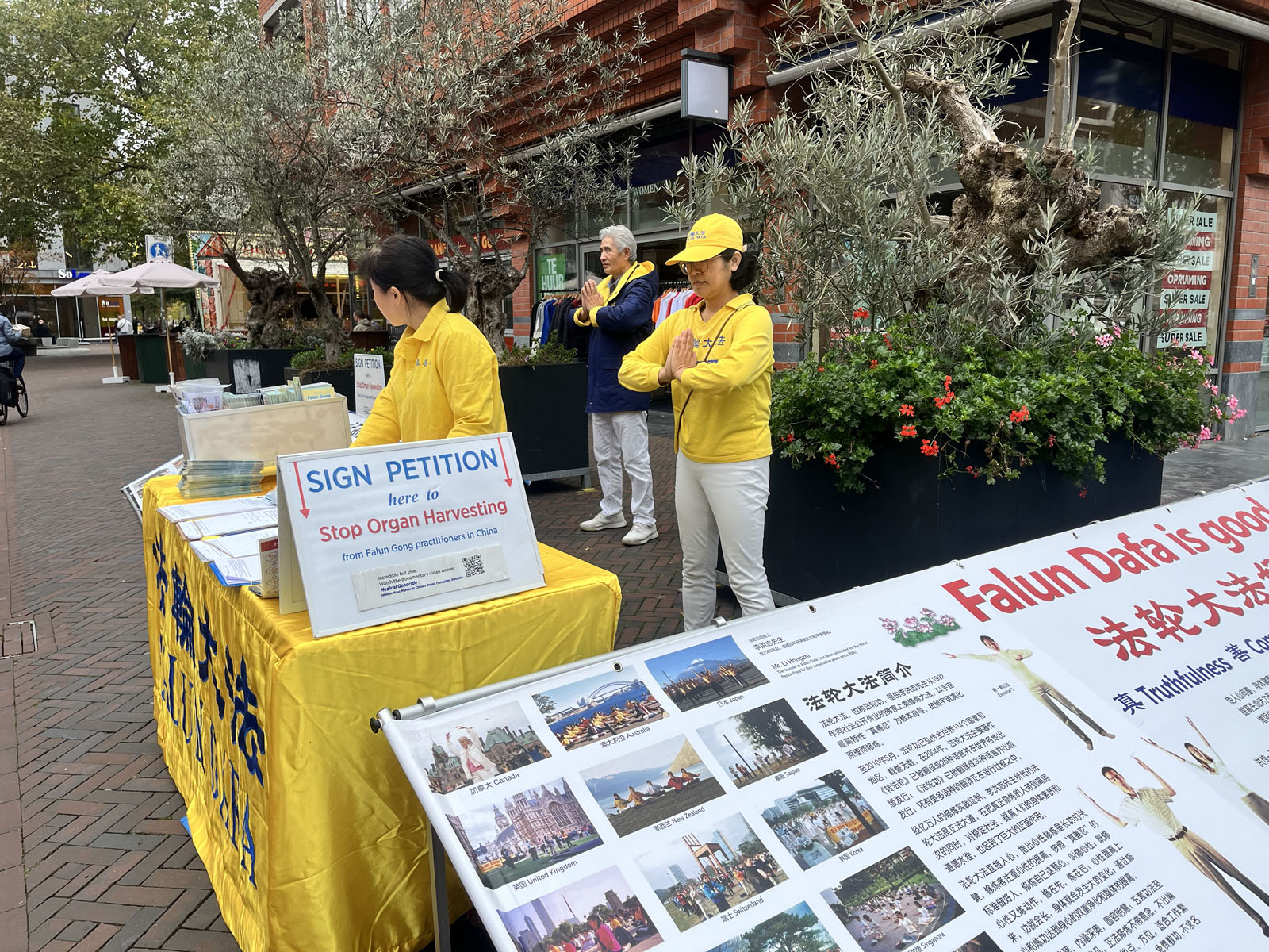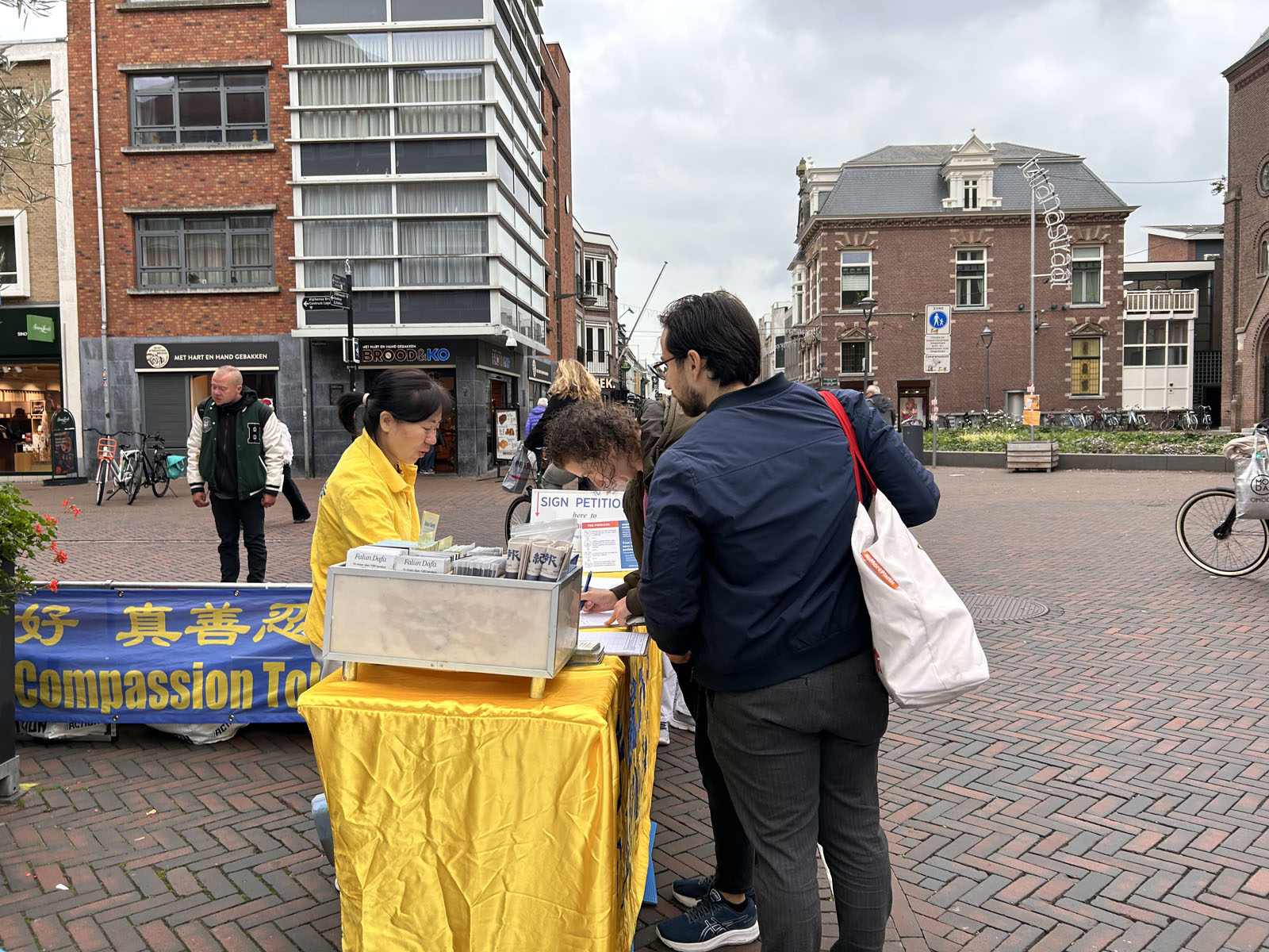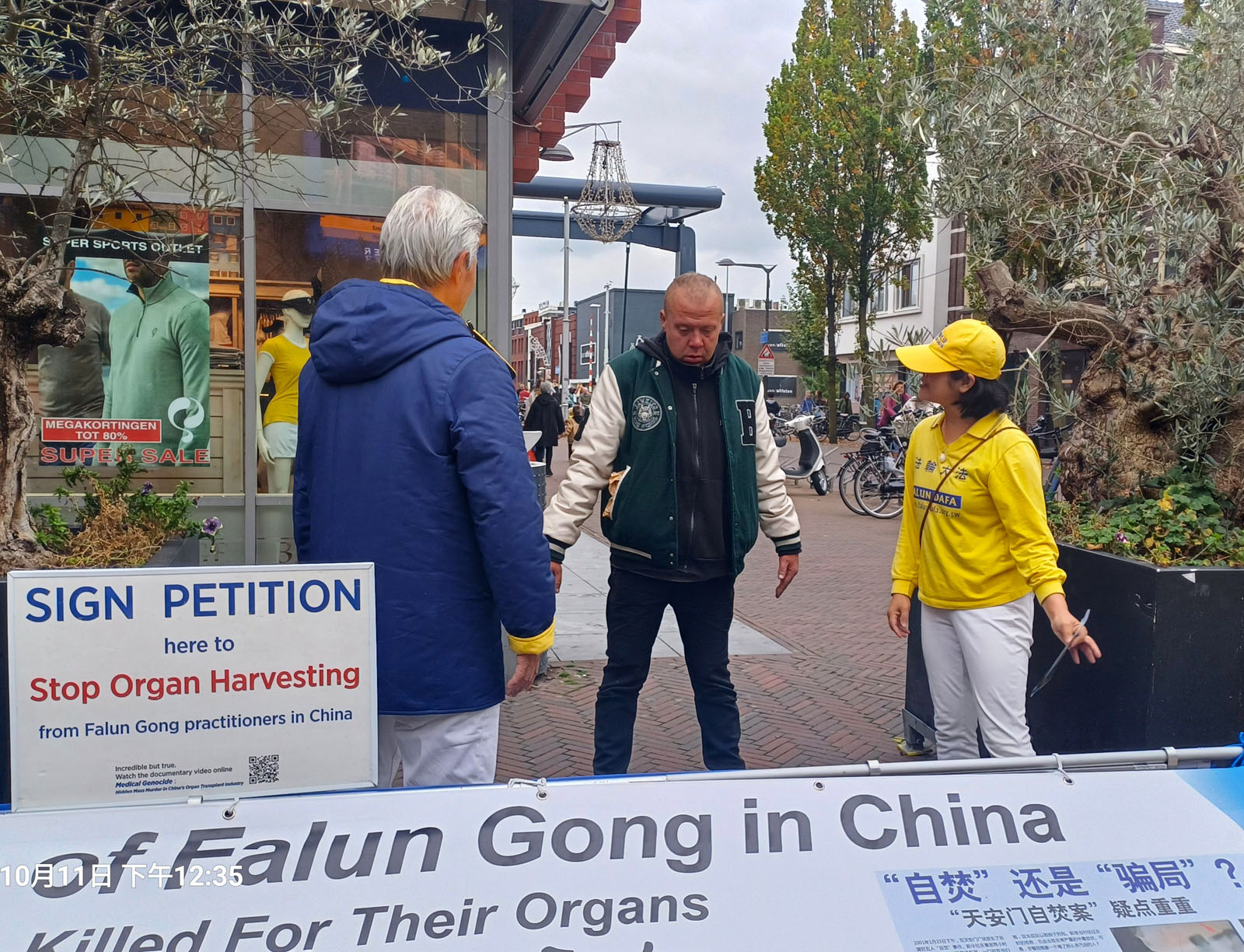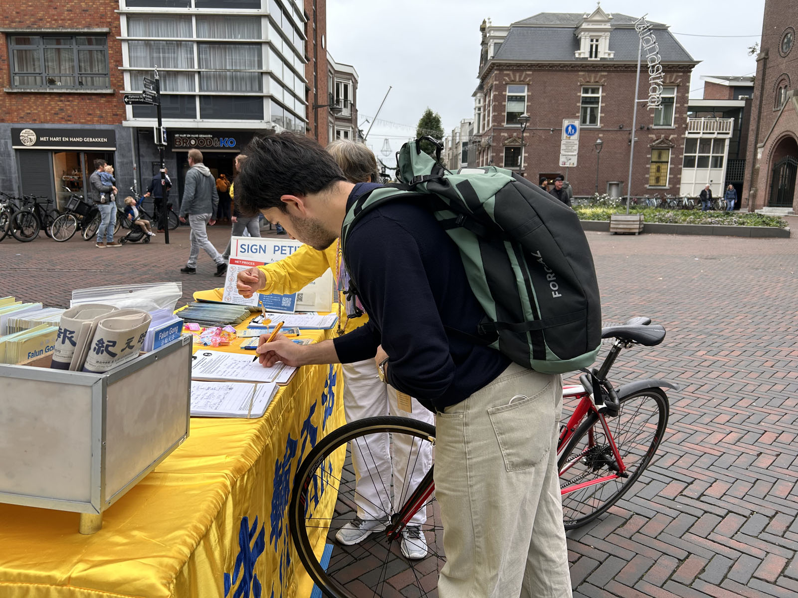 萊茵河畔阿爾芬(Alphen aan den rijn)是南荷蘭省(Zuid Holland)的一個市鎮。擁有約十二萬居民,總面積為一百三十二平方公里。中午時分,學員們在尤利婭娜街(Julianastraat)布置真相展板,展示法輪功五套功法,與民眾講述真相,向民眾徵集反對迫害的簽名。人們認真跟著學煉功動作,向學員了解大法真相。