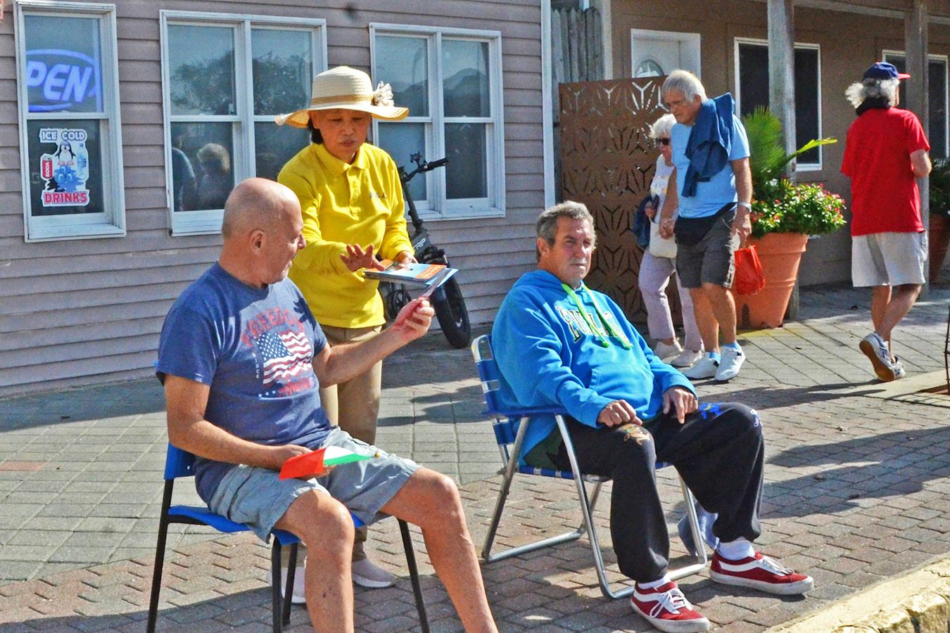 還有一位老太太和朋友一同前來,詢問活動經費來源。學員向她解釋:「我們每個人都有正常的工作、學習和生活,學員自願拿出部份收入來支持活動。」隨後學員向她講述了中共迫害法輪功的情況,許多人因此失去工作和家庭。她聽後由衷地說:「我很佩服你們。」