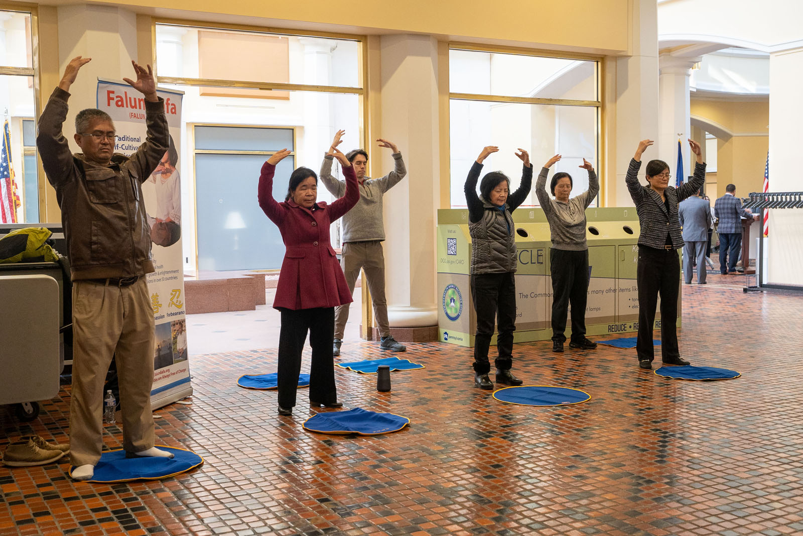 ![]() 圖5:法輪功學員在賓州議會大廈舉行的法輪大法宣傳日活動上演示法輪功功法。 |