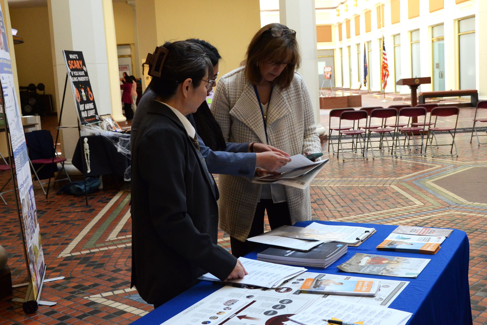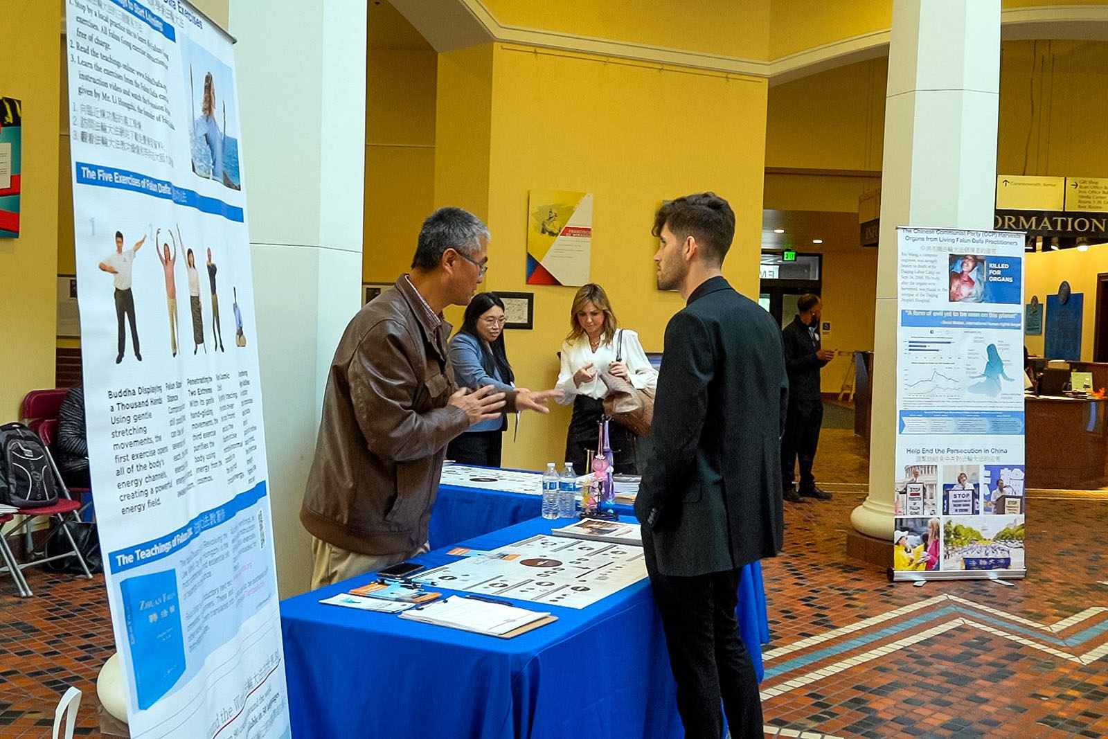 ![]() 圖6~10:法輪功學員在美國賓州首府哈里斯堡的州議會大廈內舉行的真相日活動中,向州政府人員講法輪功真相。 |