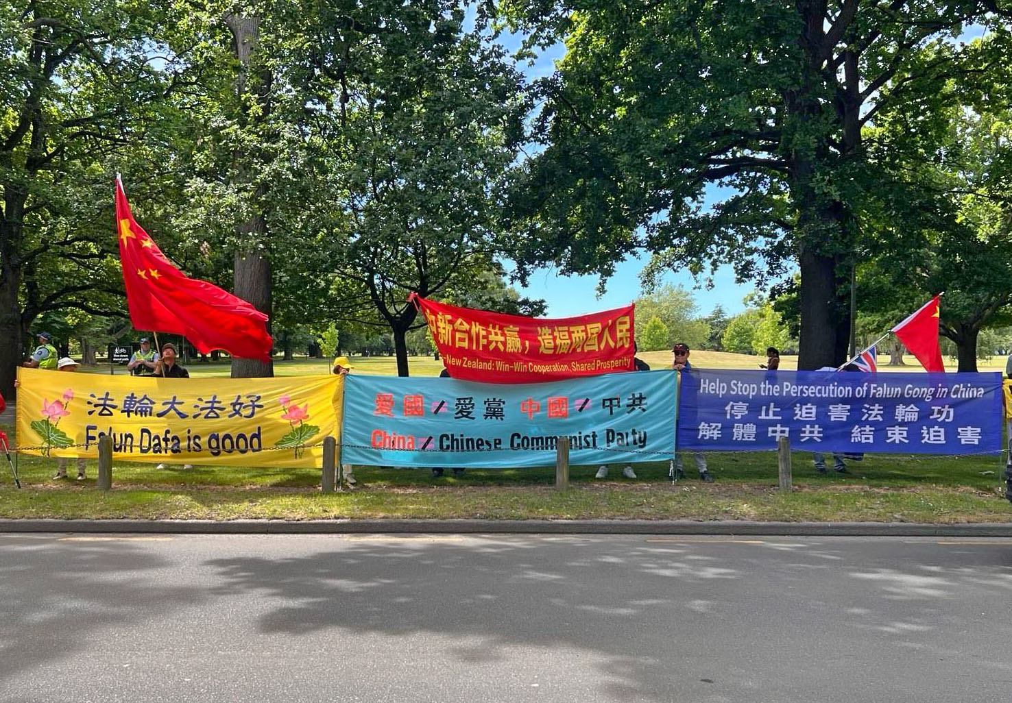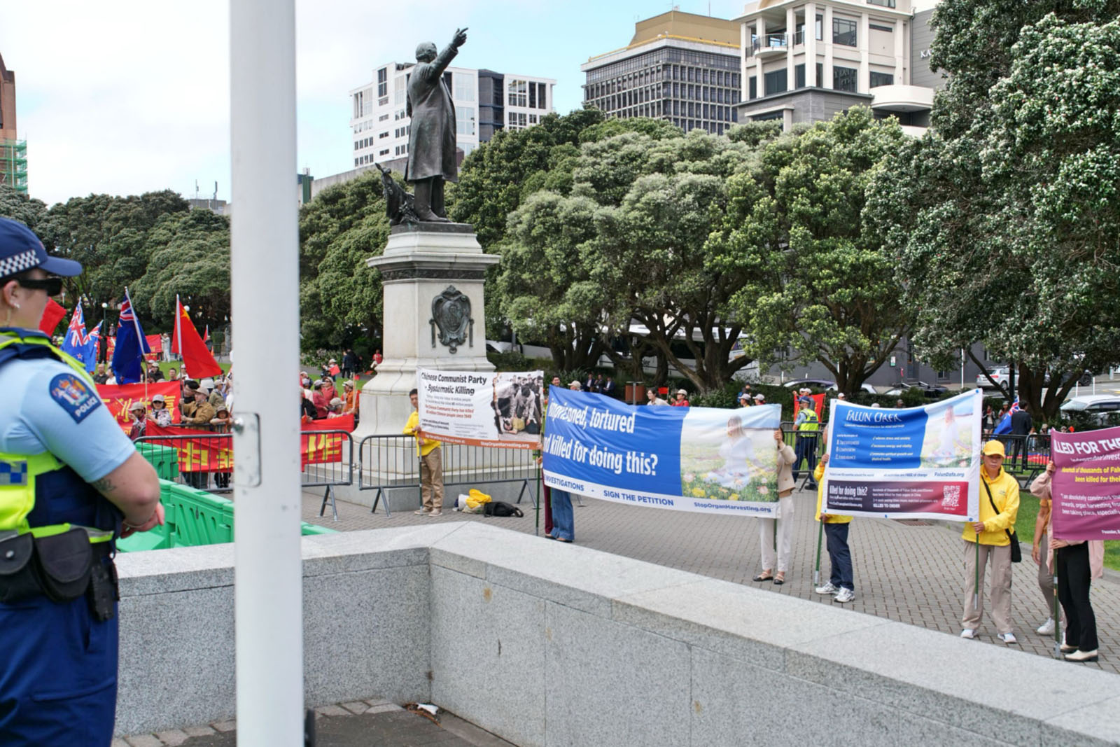 在和平理性抗議的法輪功團體旁邊,與之形成鮮明對比的是,一些親共華人團體成員卻進行多次無理干擾。他們試圖遮擋橫幅、舉著貼近的標語阻擋搗亂,並以高聲叫喊、敲鑼打鼓等方式製造噪音,試圖破壞集會秩序。這些行為不僅引起現場路人的側目,也多次導致惠靈頓國會安保人員和警方到場制止,並協調雙方保持距離,確保現場安全。