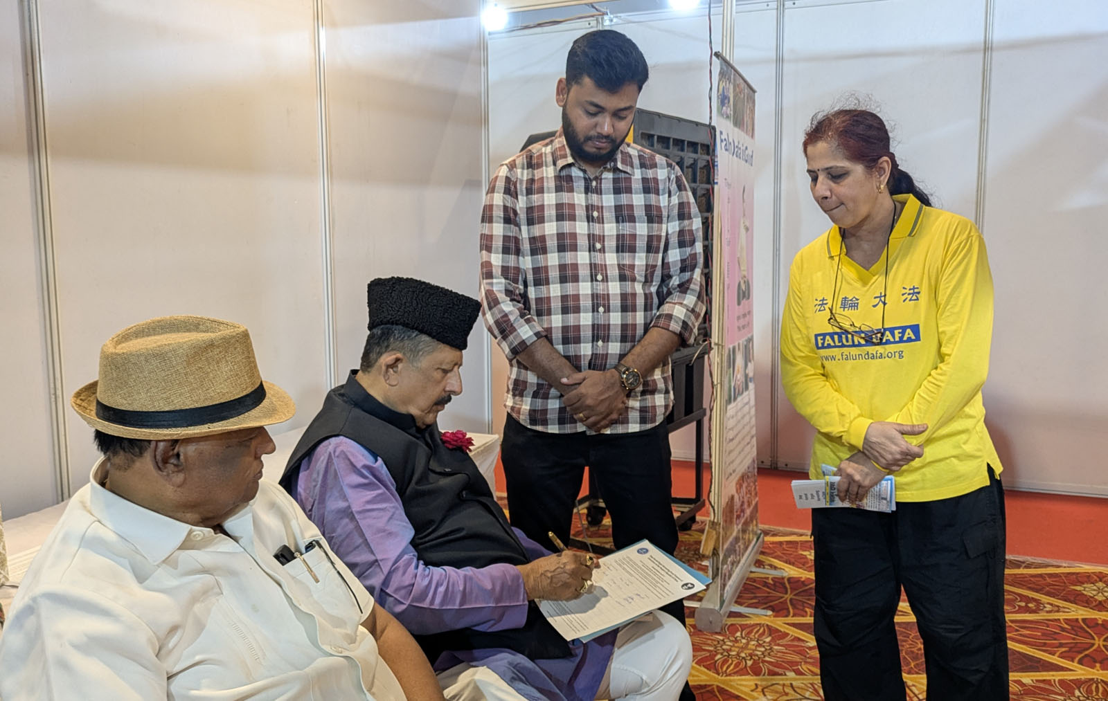 在開幕式上,法輪功學員有機會向書展主要賓客維什瓦斯﹒帕蒂爾先生(Mr. Vishwas Patil )介紹法輪大法。帕蒂爾先生是一位著名的馬拉地語作家,也是一位前印度行政服務官員。學員們向他簡要介紹了法輪大法,並贈送給他一些法輪大法資料。