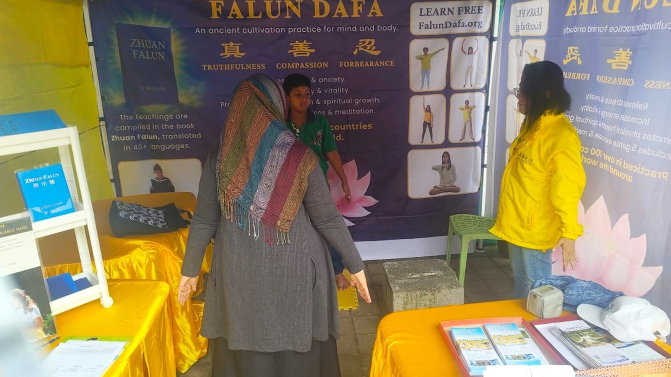 在展位前,學員們演示法輪大法功法,很多人好奇地在一旁觀看。義工們熱情而詳盡地介紹法輪大法,許多參觀者迫不及待地學煉功法。參觀者伊姆蘭(Imran)表達了他的欽佩之情,他對學員們說:「你們付出自己的時間,做得非常好。」學員們無私地講述修煉的益處,以及法輪功學員在中國遭受的迫害,他對此深感敬佩。
