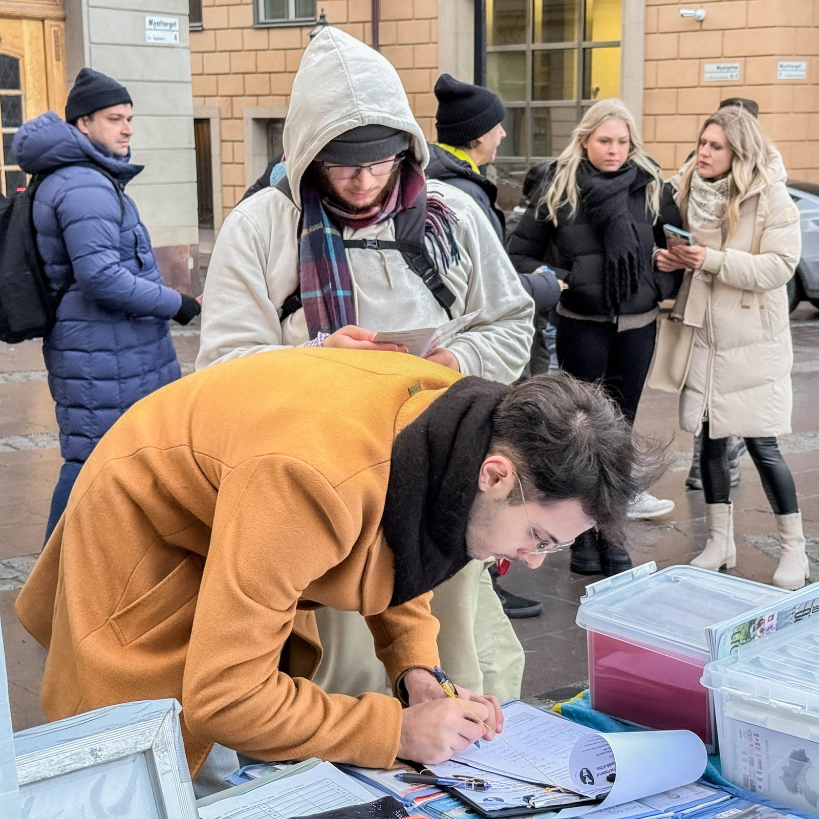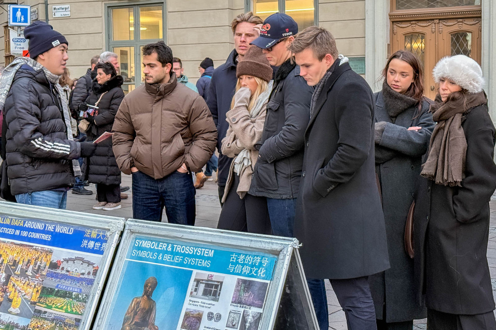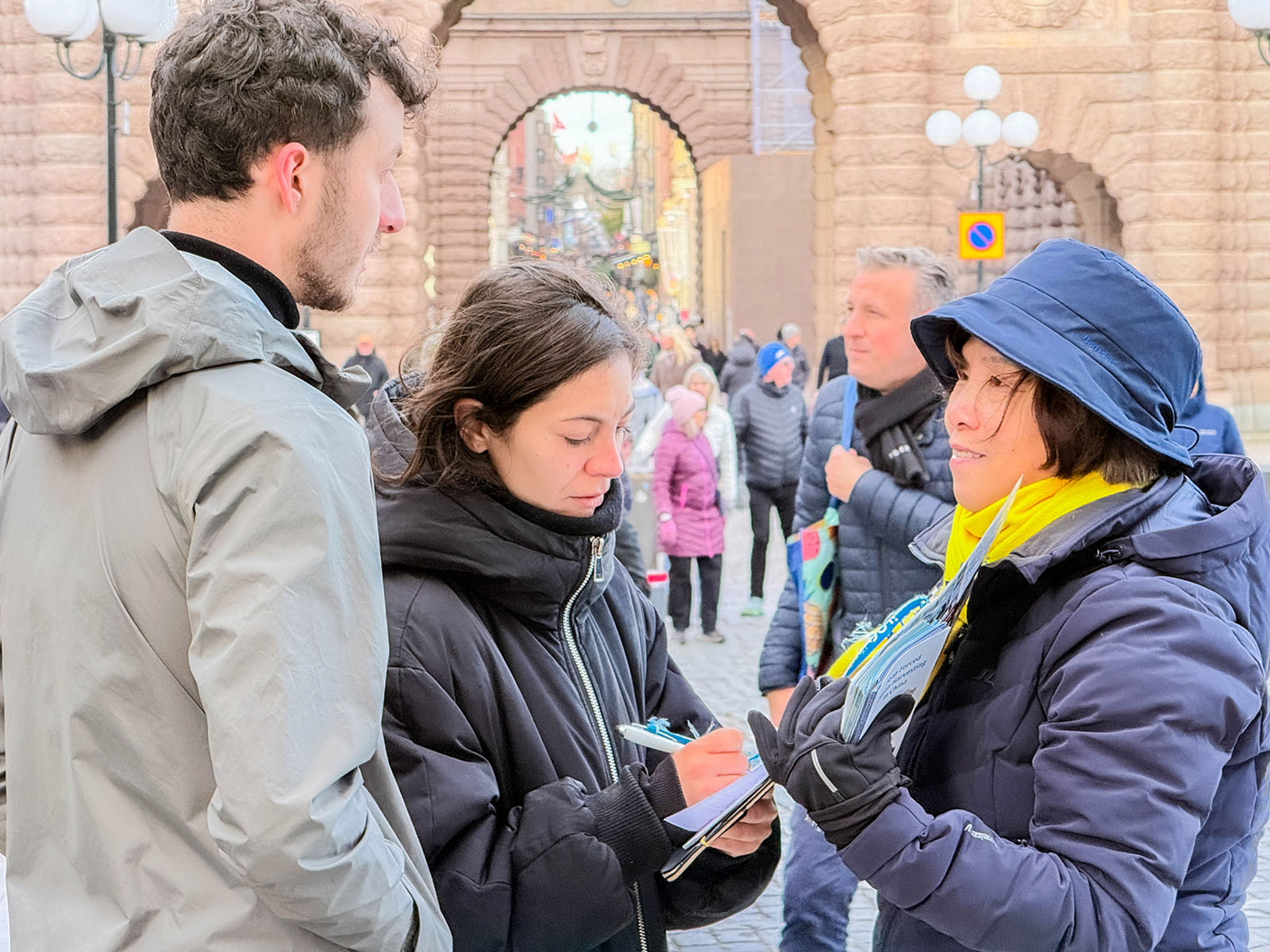 十一月份正值位於斯德哥爾摩老城附近、瑞典傳統的聖誕市場開啟。法輪功學員的活動展位是通往老城、皇宮的必經之路,遊客川流不息。活動現場氣氛祥和,有學員伴隨著煉功音樂展示法輪功的五套功法,傳遞真、善、忍的美好;也有學員與路人交談傳遞真相、發傳單、反迫害徵簽,揭露中共迫害法輪功以及活摘法輪功學員器官的罪行。