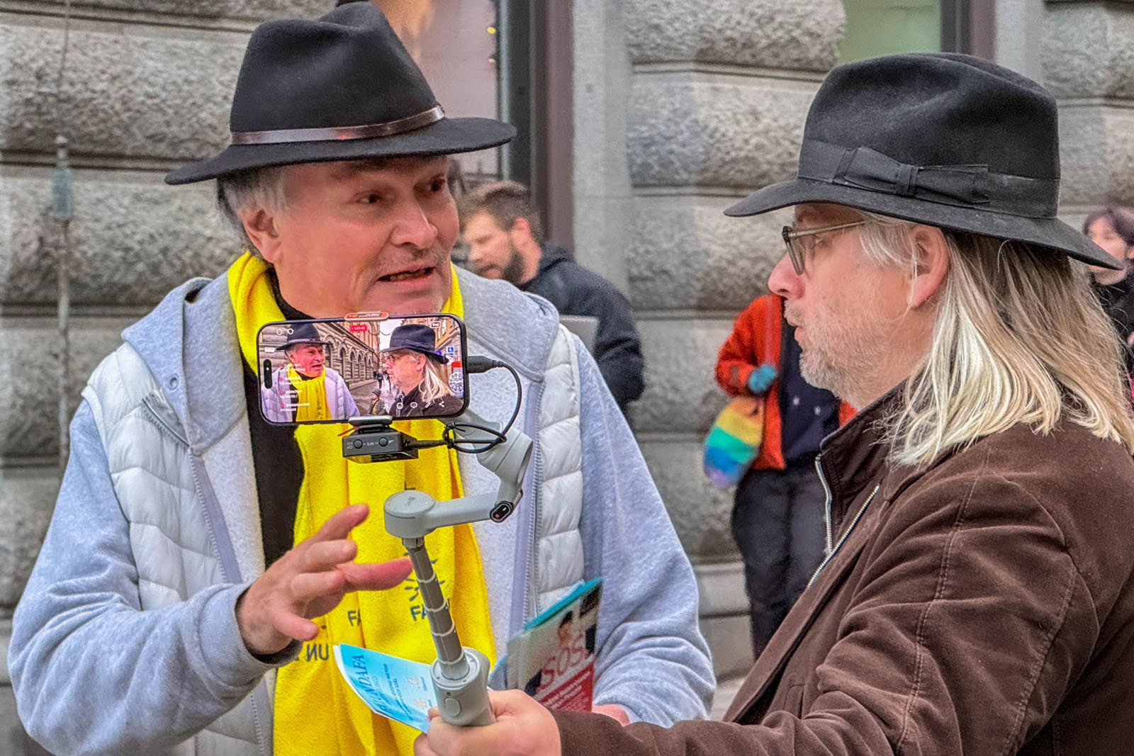 ![]() 圖7:十一月二十九日活動期間,一位瑞典自媒體人對學員進行現場採訪,並表示願意幫助法輪功學員傳遞真相。 |