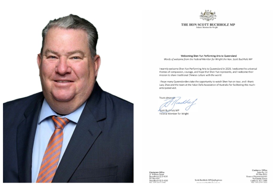 聯邦議員斯科特﹒布赫霍爾茨(Hon Scott Buchholz MP)先生在賀信中表示:「我由衷讚賞神韻藝術團所展現的善良、勇氣與希望的普世價值,她向全世界弘揚中華傳統文化的使命令人稱頌。我衷心期盼昆士蘭民眾珍惜這次難得的機會,觀賞神韻演出。」
