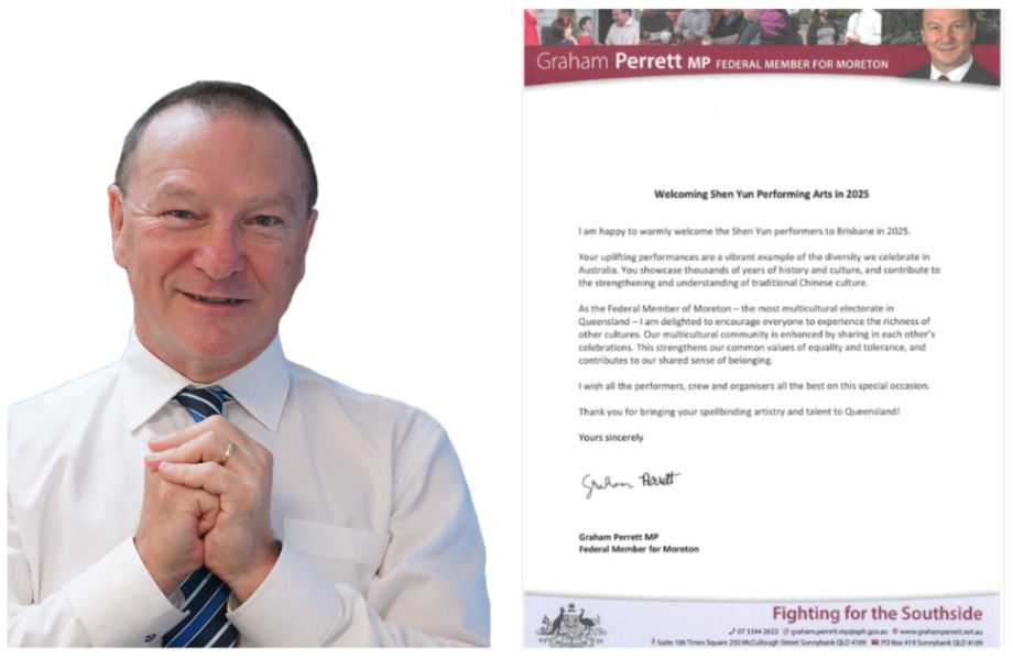 澳洲聯邦議員格雷厄姆﹒佩雷特(Graham Perrett MP)先生感謝神韻藝術團「將令人嘆為觀止的藝術與卓越才華帶到昆士蘭!」他還表示:「你們呈現了數千年的中華歷史與文化,進一步弘揚並加深了人們對中華傳統文化的認知。」