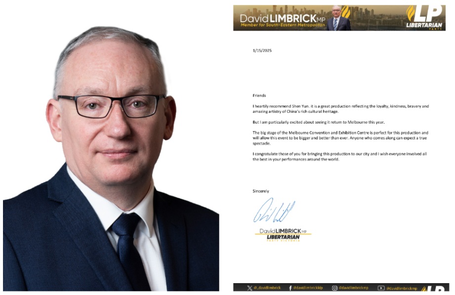 維州立法會議員大衛﹒林布裏克(David Limbrick MP)先生表示:「我衷心推薦神韻演出。作為一部偉大的巨作,她展現了忠誠、善良、勇敢以及中國豐富文化遺產中非凡的藝術底蘊。」「所有到場觀眾都將迎來一場真正的視覺奇觀。」