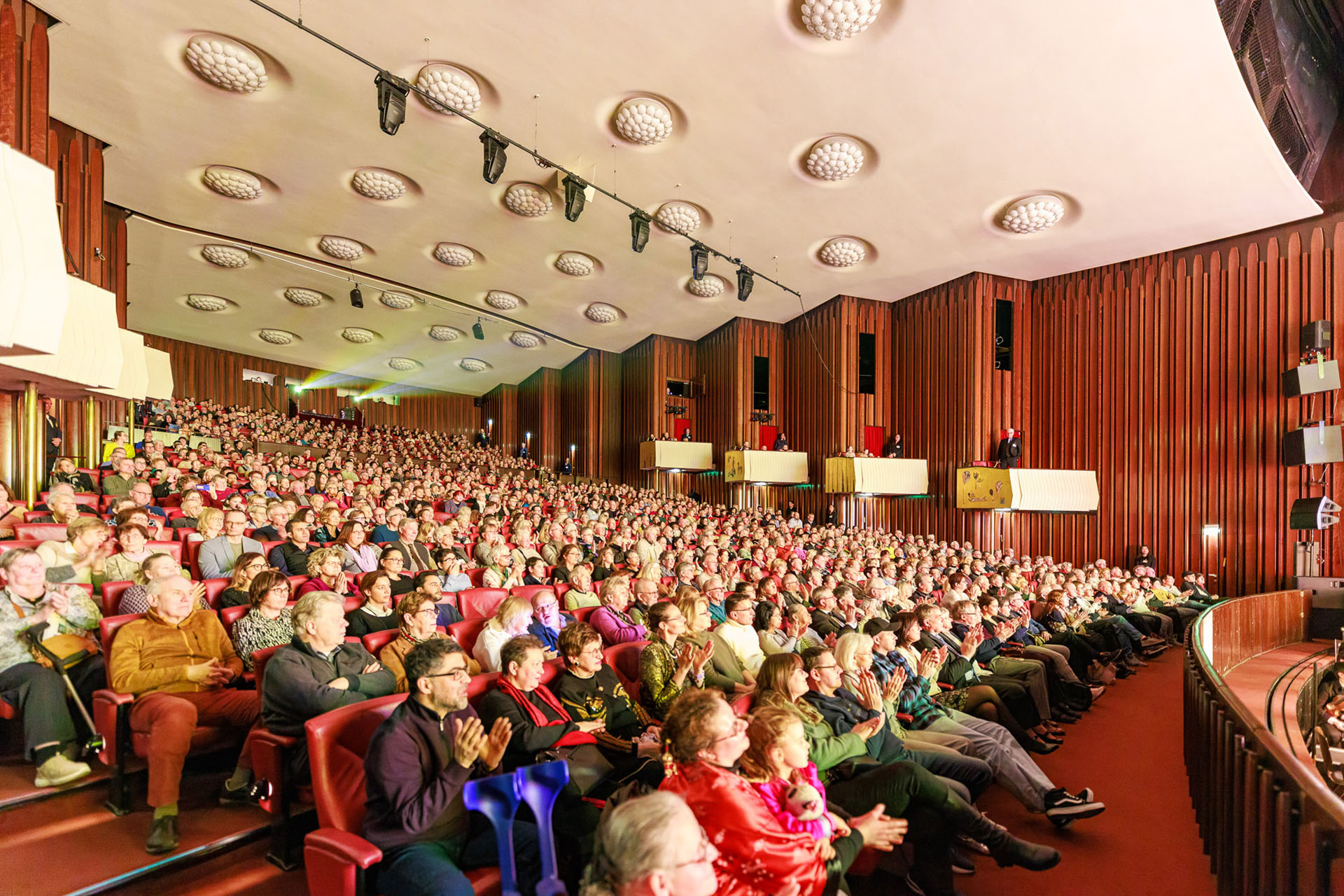 ![]() 圖5:二零二五年二月十五日下午,美國神韻國際藝術團在德國魯爾河畔米爾海姆的城市劇院戲劇廳(Stadthalle Mülheim an der Ruhr─Theatersaal)的第四場演出門票全部售罄。現場氣氛熱烈,大幕剛一拉開,觀眾席上就爆發一陣熱烈的掌聲。整場演出,掌聲不斷。演出結束後,很多觀眾起立鼓掌,藝術家們兩次謝幕。(大紀元) |