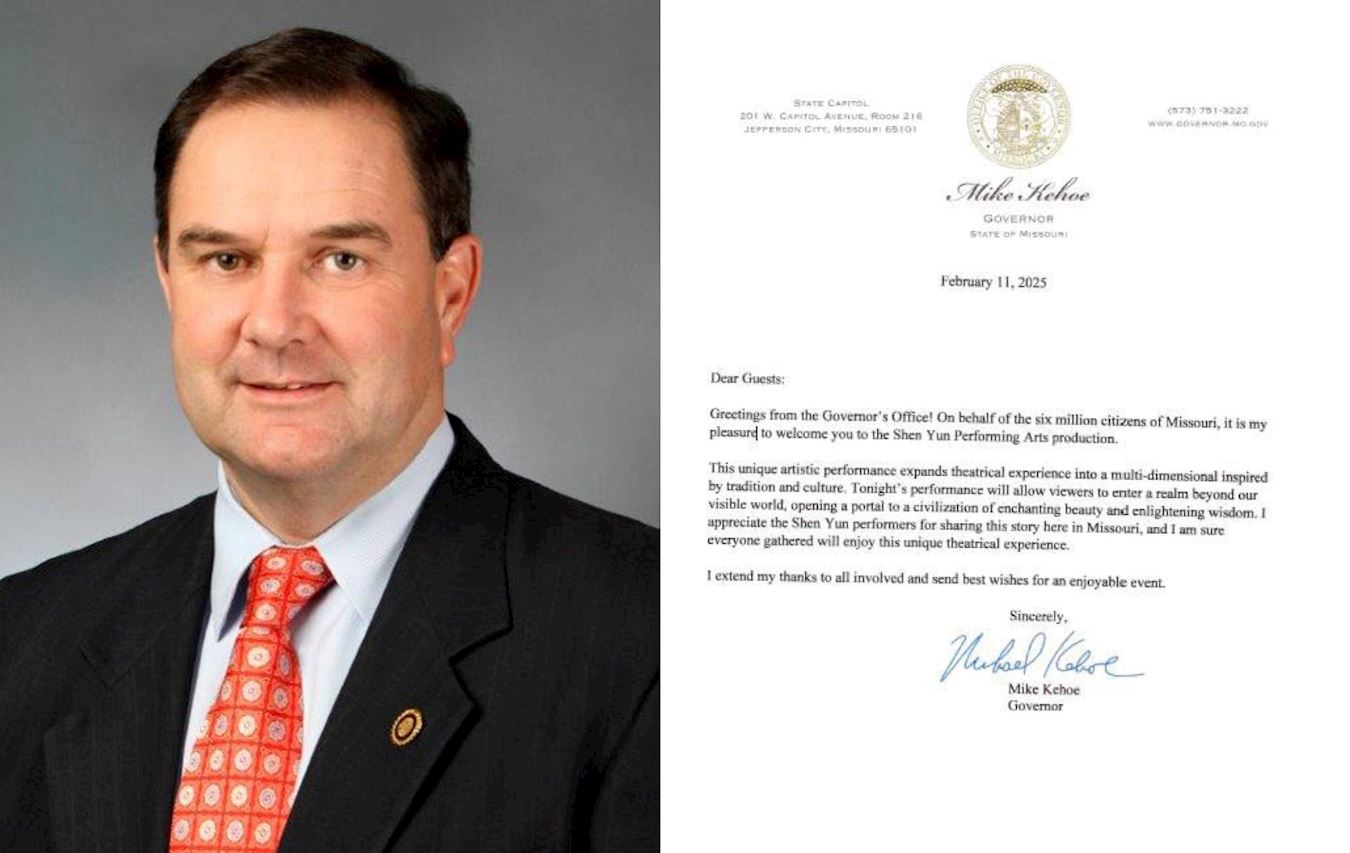 ![]() 圖1:美國密蘇裏州州長邁克﹒基霍(Mike Kehoe)發來賀信。(明慧網合成) |