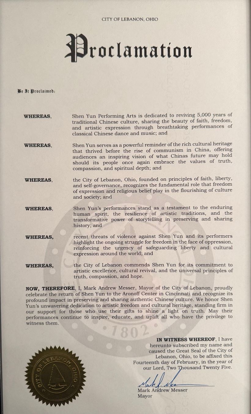 ![]() 圖3:二零二五年二月十五日,俄亥俄州黎巴嫩市(Lebanon)市長馬克﹒安德魯﹒梅塞爾(Mark Andrew Messer,右一)觀賞了神韻巡迴藝術團在辛辛那提阿羅諾夫藝術中心(Aronoff Center for the Arts)的首場演出,並為神韻頒發褒獎。(大紀元) |