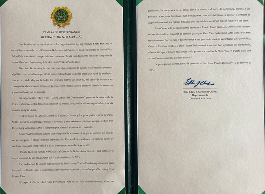 二零二五年二月十日,在美國神韻新世界藝術團為波多黎各觀眾帶來本演出季最後一場演出之前,波多黎各眾議院議員艾迪﹒查博尼爾﹒奇尼(Eddie Charbonier Chinea)在波多黎各國會大廈向神韻藝術團代表,以及波多黎各法輪大法協會代表頒發褒獎,感謝神韻蒞臨波多黎各帶來文化藝術盛宴。