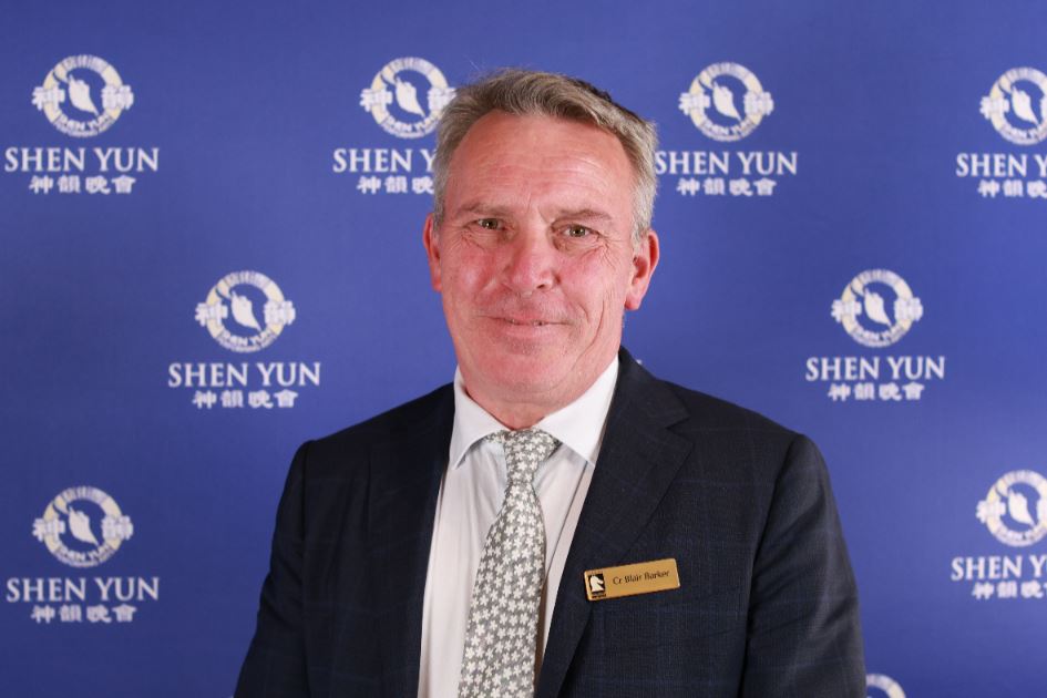![]() 圖9:二零二五年二月十五日晚,澳大利亞維州白馬市議員布萊爾﹒巴克(Blair Barker)欣賞了美國神韻環球藝術團在澳洲墨爾本的演出。(新唐人電視台) |