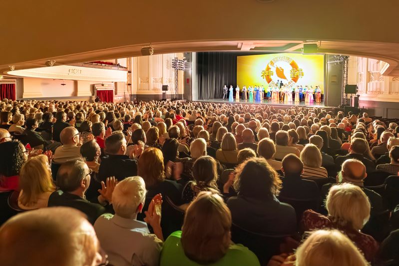 ![]() 圖3:二零二五年三月六日晚,神韻紐約藝術團在英國伯恩茅斯長亭劇院(Bournemouth Pavilion Theatre)的最後一場演出爆滿。(大紀元) |