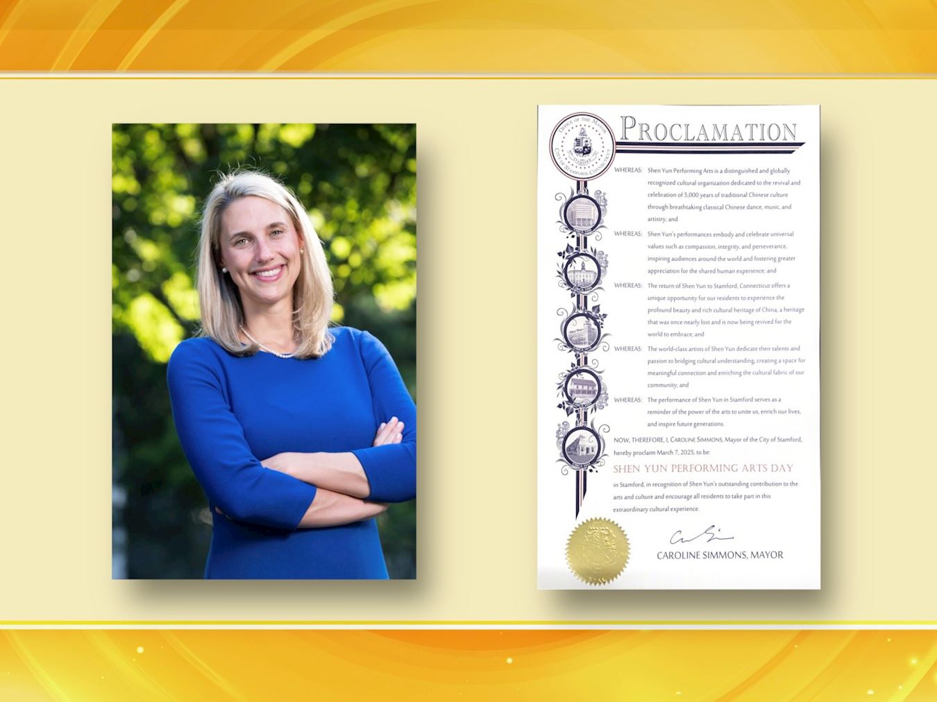 ![]() 圖7:美國康州斯坦福市(City of Stamford)市長卡洛琳‧西蒙斯(Caroline Simmons)祝賀神韻蒞臨斯坦福,宣布二零二五年三月七日為「神韻藝術團日」。(大紀元合成) |
