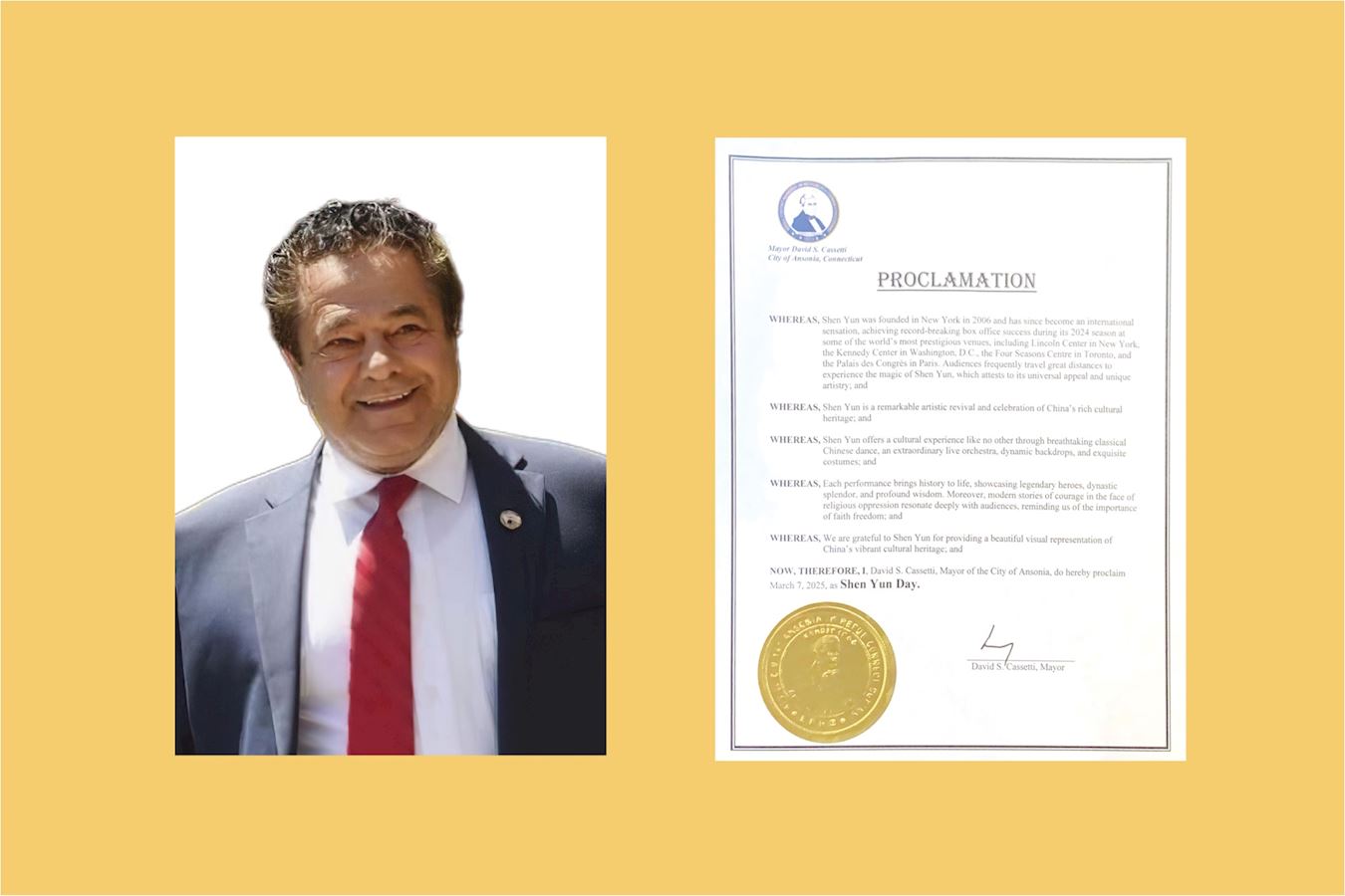 ![]() 圖8:美國康州安索尼亞市(City of Ansonia)市長戴維‧S‧卡塞蒂(David S. Cassetti)宣布二零二五年三月七日為「神韻日」。(大紀元合成) |