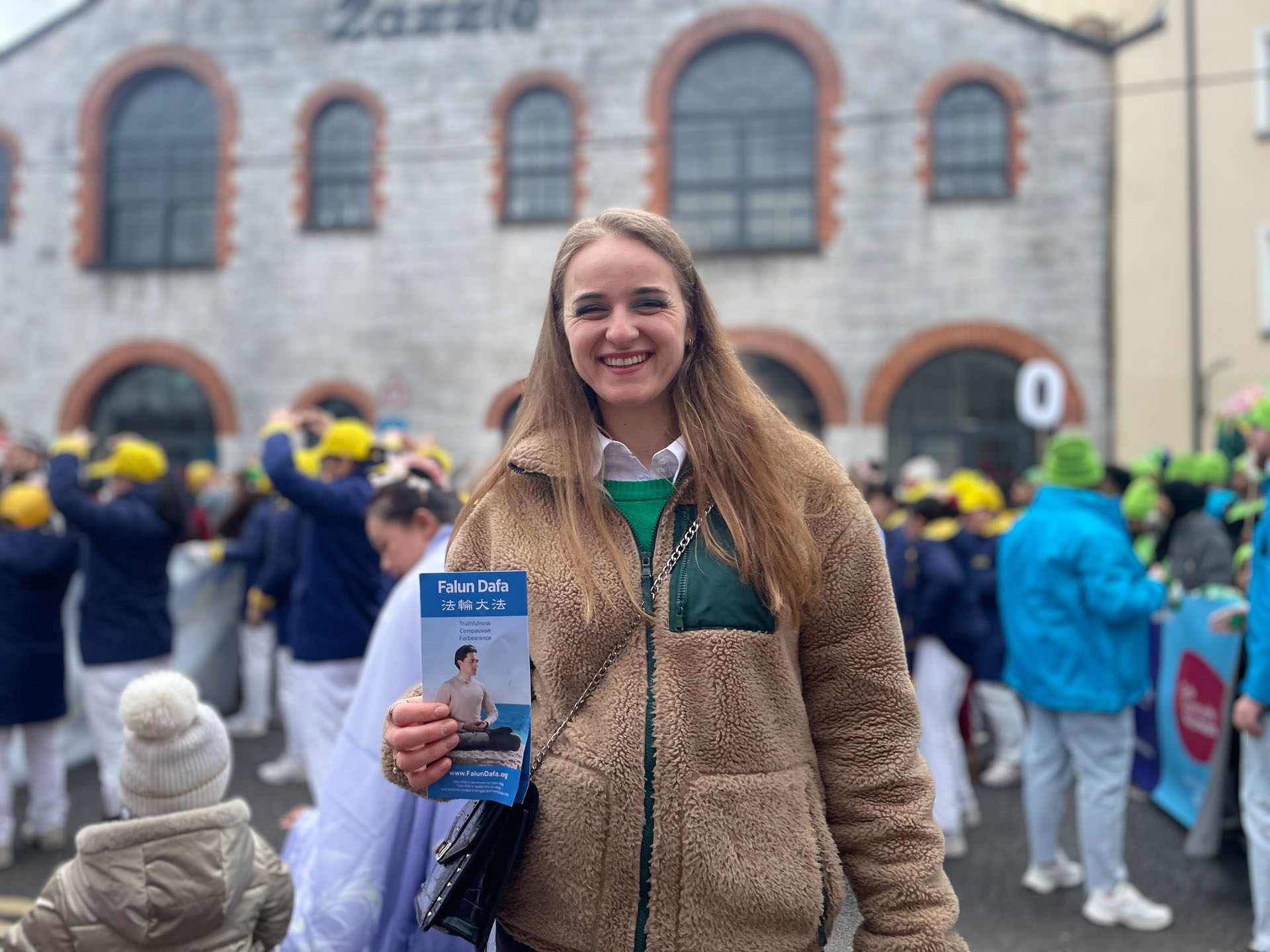 來自法國的梅蘭妮(Melanie)在科克攻讀科學博士學位,當天來現場觀看大遊行,藉此了解到了甚麼是法輪功。看到正在展示功法的學員,梅蘭妮說,「我感覺到功法非常平和,令人放鬆」。