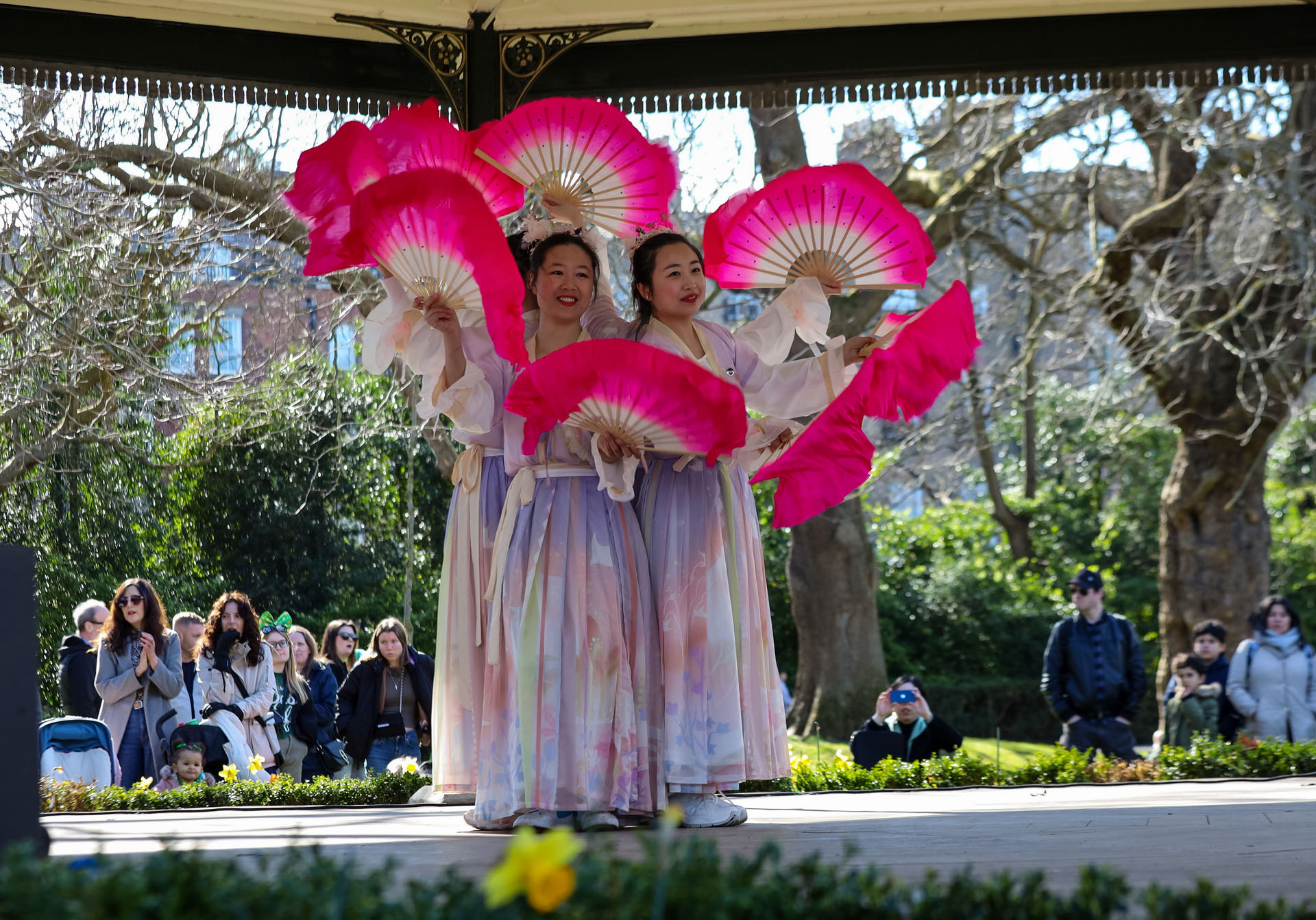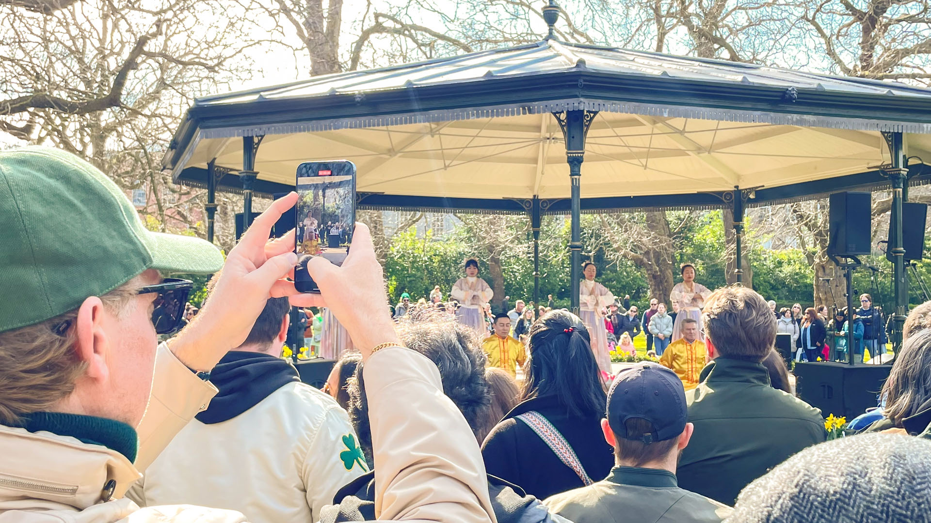 三月十六日,部份法輪功學員還參加了首府都柏林的「聖帕特裏克節」表演活動。學員身著色彩明麗的傳統服飾,為觀眾帶來了蓮花舞和扇子舞,並展示了法輪功的功法。簡單易學的功法部份吸引不少觀眾跟隨音樂一起煉功。