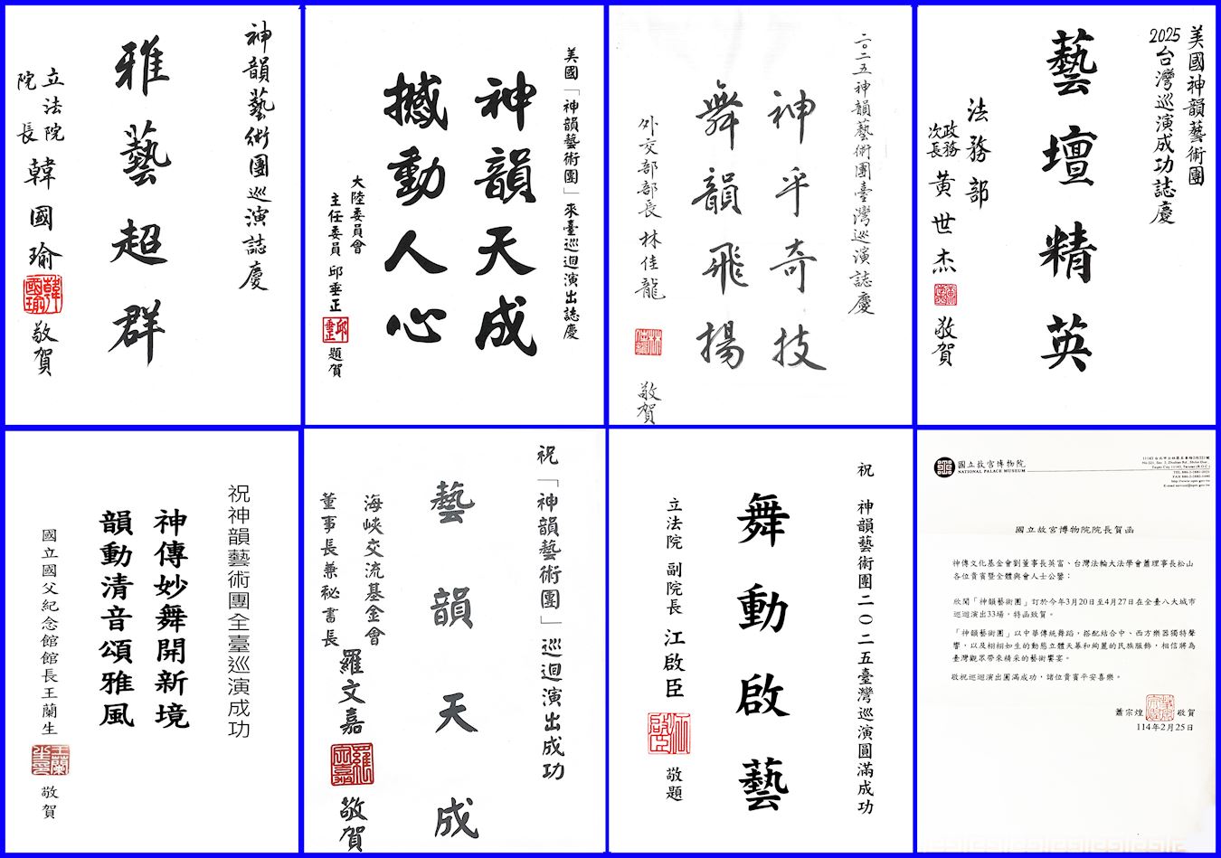 今年有八位中央政府官員致贈賀詞,立法院長韓國瑜以「雅藝超群」向神韻致意。曾經觀賞過神韻演出的外交部長林佳龍則說神韻是「神乎其技、舞韻飛揚」。法務部政務次長黃世傑也讚譽神韻是「藝壇精英」。立法院副院長江啟臣讚揚神韻「舞動啟藝」。