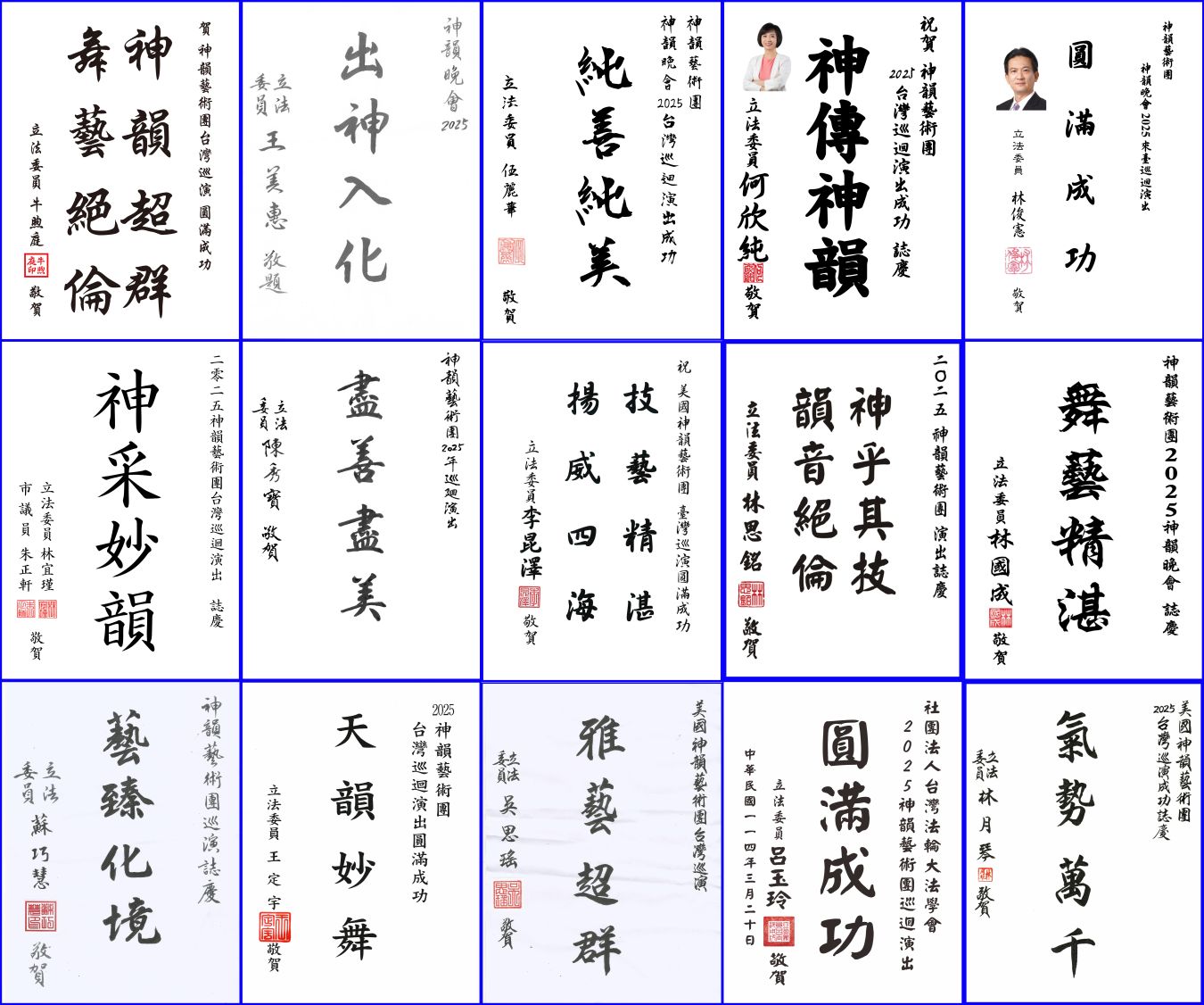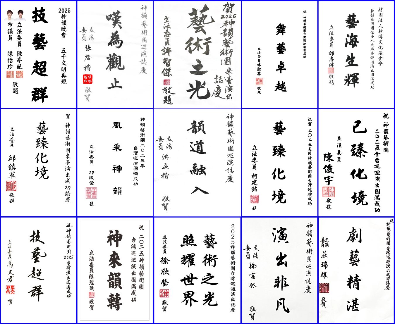 此外,台灣十五位地方議會議長和四位議員也致贈賀詞,歡迎神韻再度蒞臨。包括基隆市議會議長童子賢讚神韻「神采傳遞,韻秋聲繞」,屏東縣議會議長周典論賀「神韻精湛,德音益世」,高雄市議會議長康裕成以 「神采生韻」歡迎神韻。