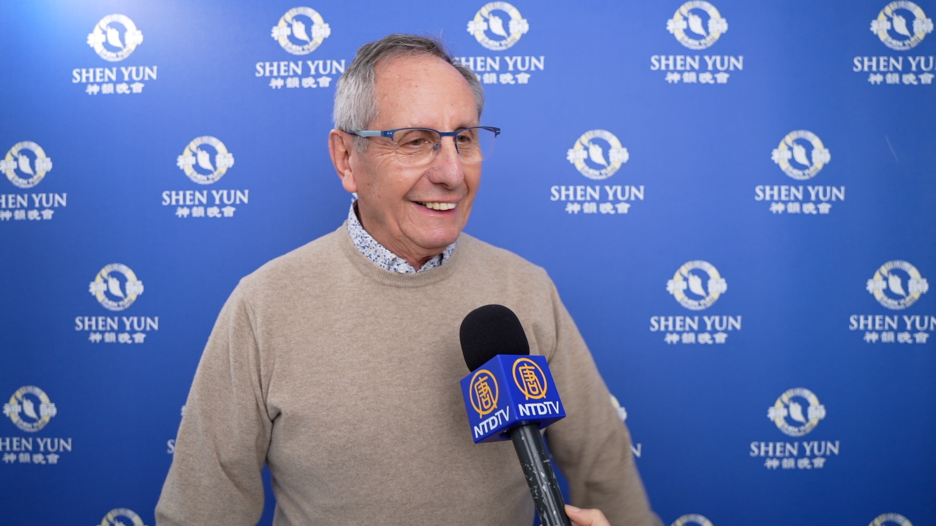 ![]() 圖8:二零二五年二月二十三日下午,法國民族文化藝術協會創始人喬爾﹒弗拉代特(Joël Fradet)觀賞了在法國南特市的神韻演出。(新唐人電視台) |