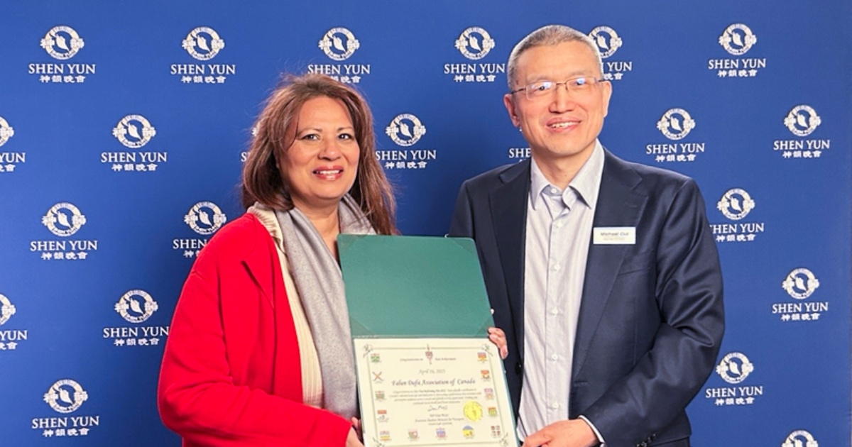 ![]() 圖7:二零二五年四月十六日晚,加拿大國會議員、交通部副影子部長丹・穆伊斯(Dan Muys)委派主管秘書莫娜-麗莎・丁(Mona-Lysa Din,左)在安河漢米爾頓第一安大略音樂廳為神韻藝術團褒獎。(新唐人電視台) |