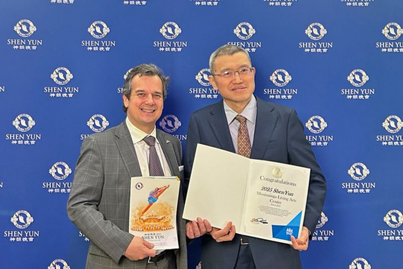 ![]() 圖4:二零二五年三月二十五日晚,加拿大安省密西沙加市議員史蒂芬‧丹斯科(Stephen Dasko)向神韻主辦方頒發褒獎。(大紀元) |