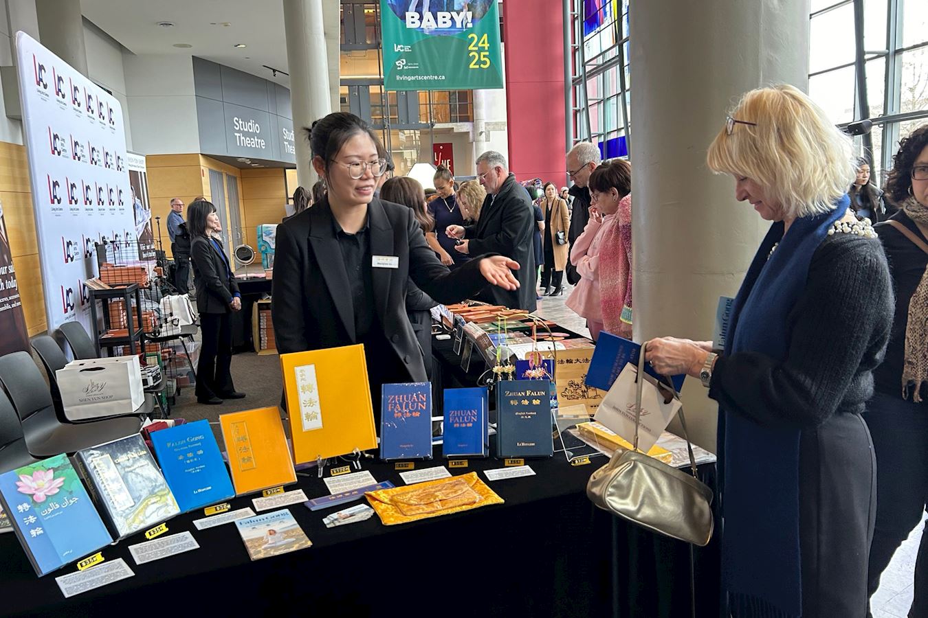 有的觀眾去年看過神韻,來到劇院直接購買大法書;有的看了上半場演出後,感受到信仰的力量,購買書籍,希望學習法輪功;有的看完演出後,感受到神韻演出淨化身心的療愈效果和強大的能量,也對法輪功非常感興趣,繼而向工作人員詢問煉功點地址,索取網上教功的信息等;還有的觀眾甚至希望現場學功。