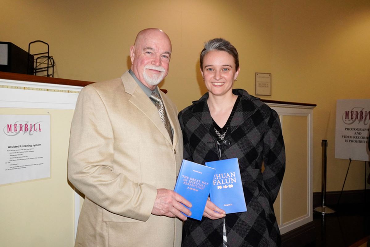 ![]() 圖4:二零二五年四月一日,美國一家網站設計公司的創始人兼執行長喬治婭﹒克恩(Georgia King)和先生、退役空軍上尉克利夫﹒克恩(Cliff King)在緬因州波特蘭欣賞了神韻演出後,對法輪大法非常感興趣,立即購買了法輪大法的相關書籍。(大紀元) |