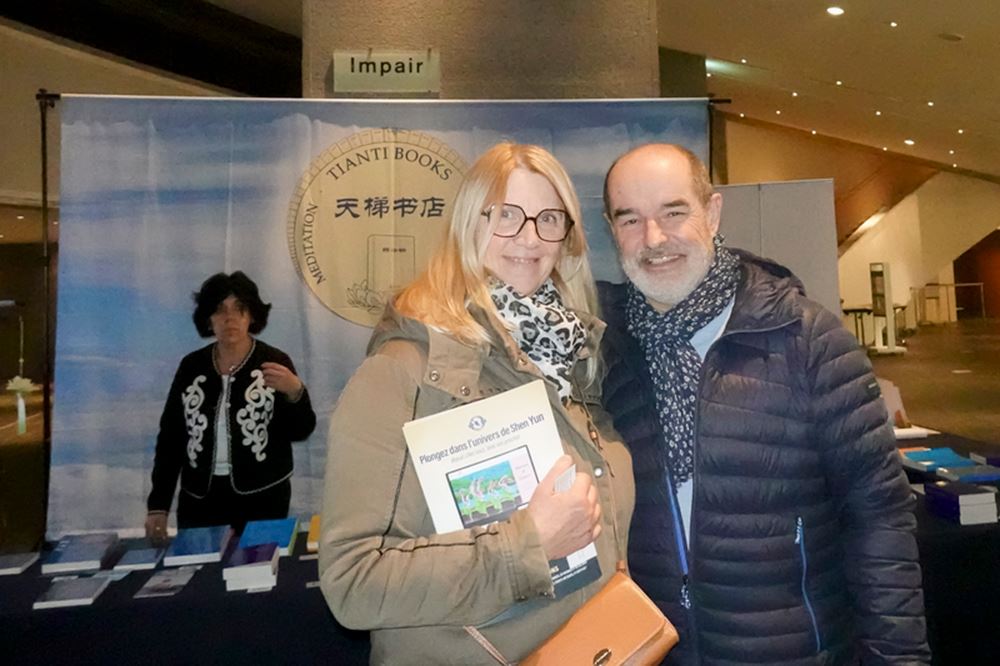 ![]() 圖7:二零二五年二月十八日晚,市府綠化部的前主任伊夫﹒蓋特(Yves Gaté)與太太安妮﹒蓋特(Annie Gaté)在法國南特市觀賞了神韻演出後,在法國天梯書店的展位上購買了法輪大法書籍。(大紀元) |