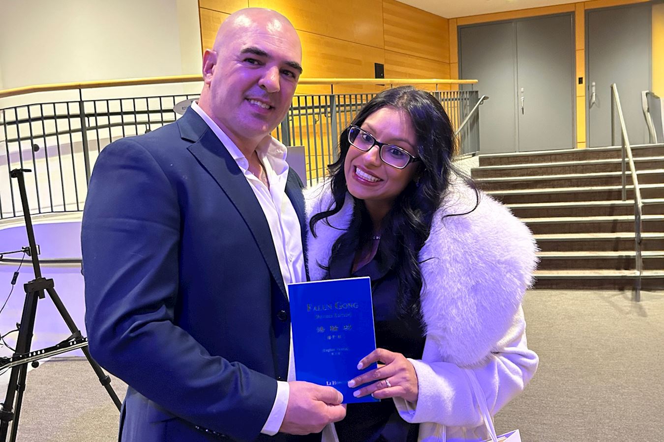 ![]() 圖9:二零二五年三月二十一日晚,移民顧問卡姆‧卡皮佐拉(Cam Capizola)和男友彼得‧卡雷羅(Peter Carreiro)在加拿大密西沙加觀賞了神韻演出。演出結束後,兩人直接來到法輪大法書籍展位,購買了一本《轉法輪》。(大紀元) |